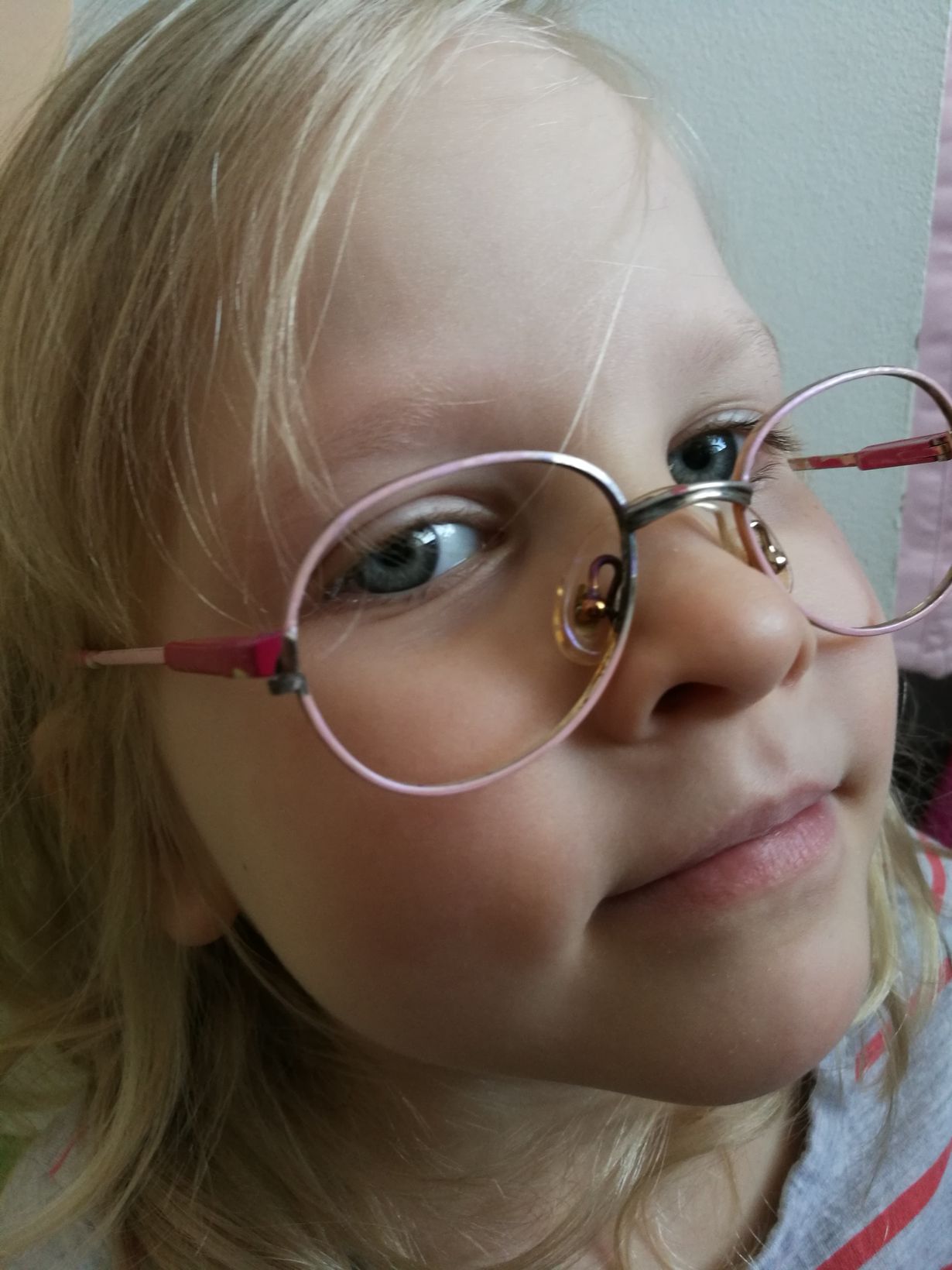 Sain uudet silmälasit ehkä neljä tai viisivuotiaana. Lasit olivat kuitenkin pienen prinsessan mielestä väärän väriset, joten äitini maalasi ne kynsilakalla ihanan vaaleanpunaisiksi. Kuvassa näkyy nenän kohdalla alkuperäinen tylsä väri. Kehykset ovat olleet lasteni leikeissä useita vuosia ja kuvassa on mallina nuorin tyttäreni.