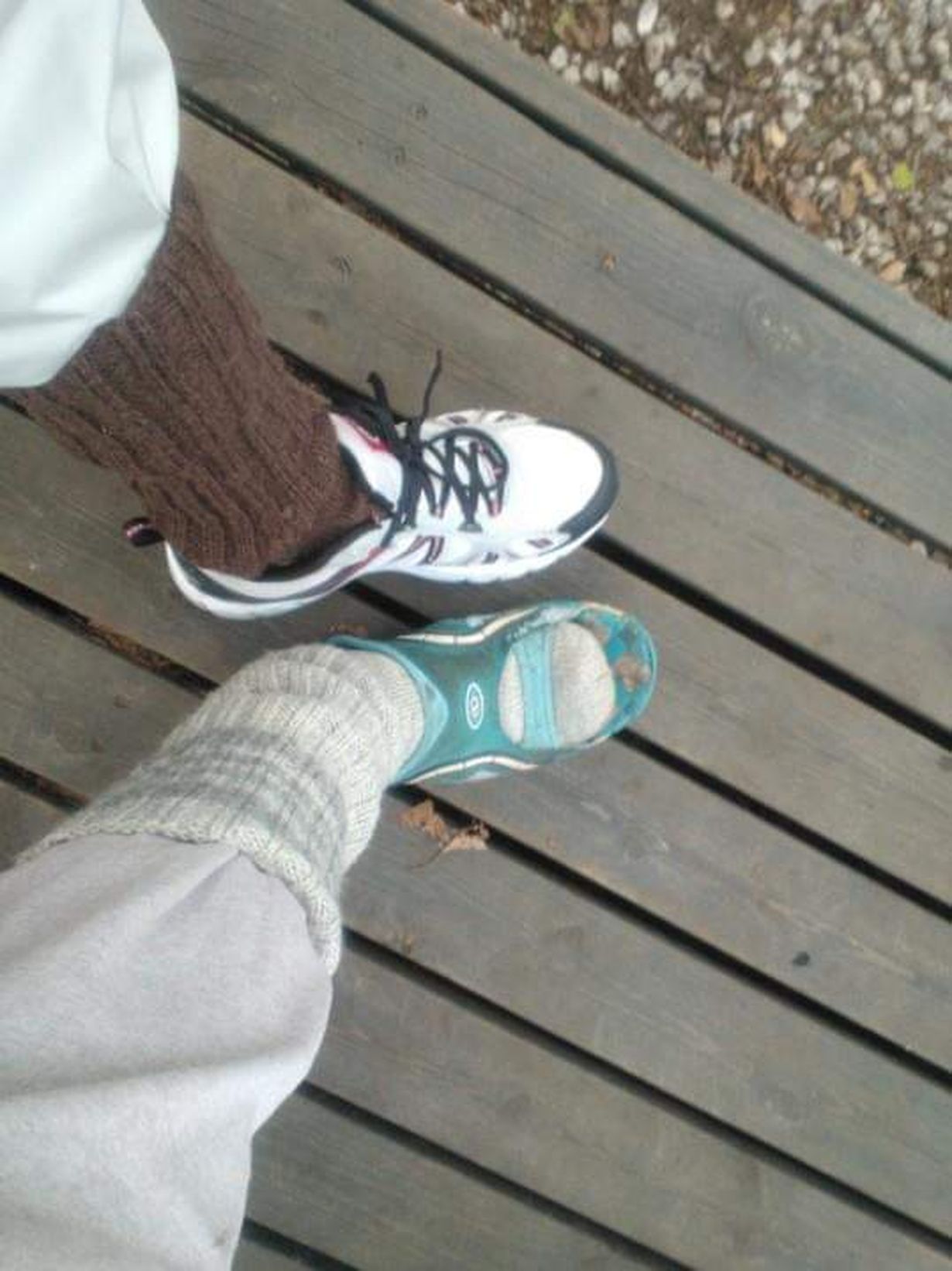pari vuotta sitten, silloin oli todella viileää. Sisko kaivoi jostain nämä vanhat villasukat lämmikkeeksi ja hyttyssuojaksikin. Sukat on kutonut hänen miehensä jo edesmennyt isoäiti.