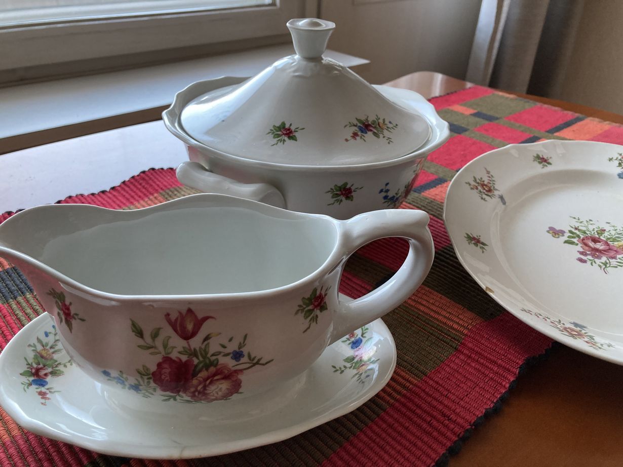 Vanhempiemme häälahja-astiasto seitsemänkymmenen vuoden takaa. Vanhempamme menehtyivät kuukauden välein ja heidän viimeiset esineet häälahja-astiastosta ovat meidän neljän lapsen yhteiset