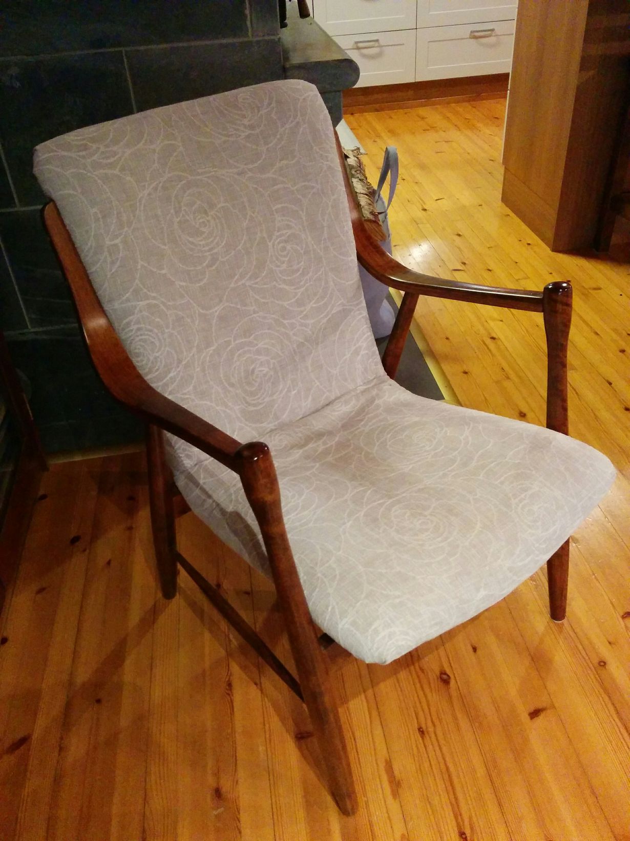 Vanhempani hankkivat 1953 kaksi nojatuolia ja senkin. Minä pelastin ne 80-luvulla navetan vintiltä. Tämä oli päällystetty isän rakkaan hevosen nahalla, nyt minun valitsemalla kankaalla. Tuolin alla oli merkki -Lahden huonekalutehdas ja toinen- Varkauden arkku ja huonekalu.