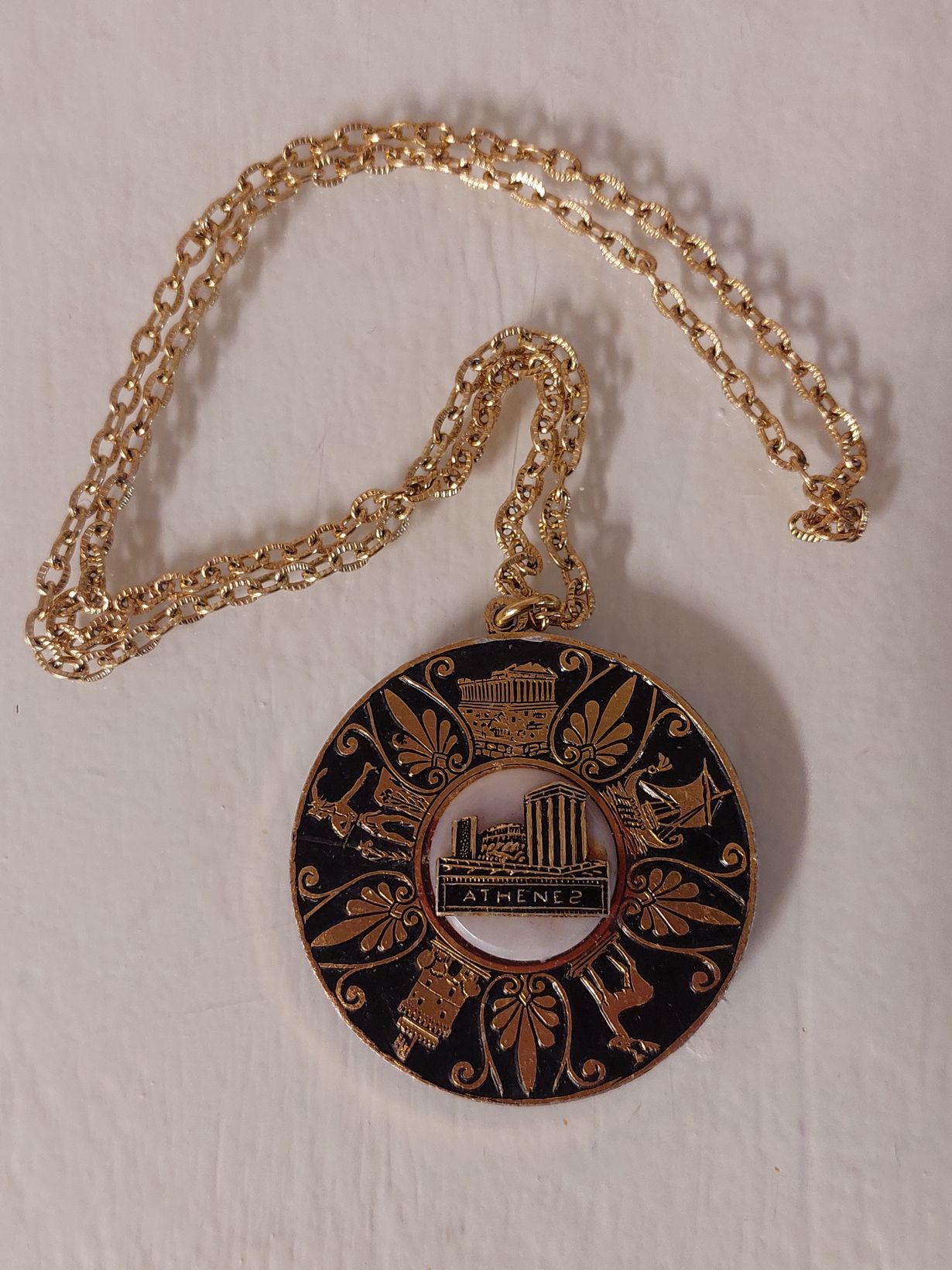 Sain tämän korun 1970 luvulla kun veljeni oli rauhanturva joukoissa YK.lla.Kun tilanne oli siellä rauhallinen,hän oli tehnyt lomamatkan Kreikkaan ja ostanut Ateenasta pikkusiskolle matka tuliaisena tämän korun. Kun pidin korua koulussa niin luokkatoverini ilkkuivat että miksi minulla on palkintomitalli kaulassa.Siltä tämä kieltämättä vähän näyttääkin,mutta tyyli on aitoa -70 lukua.