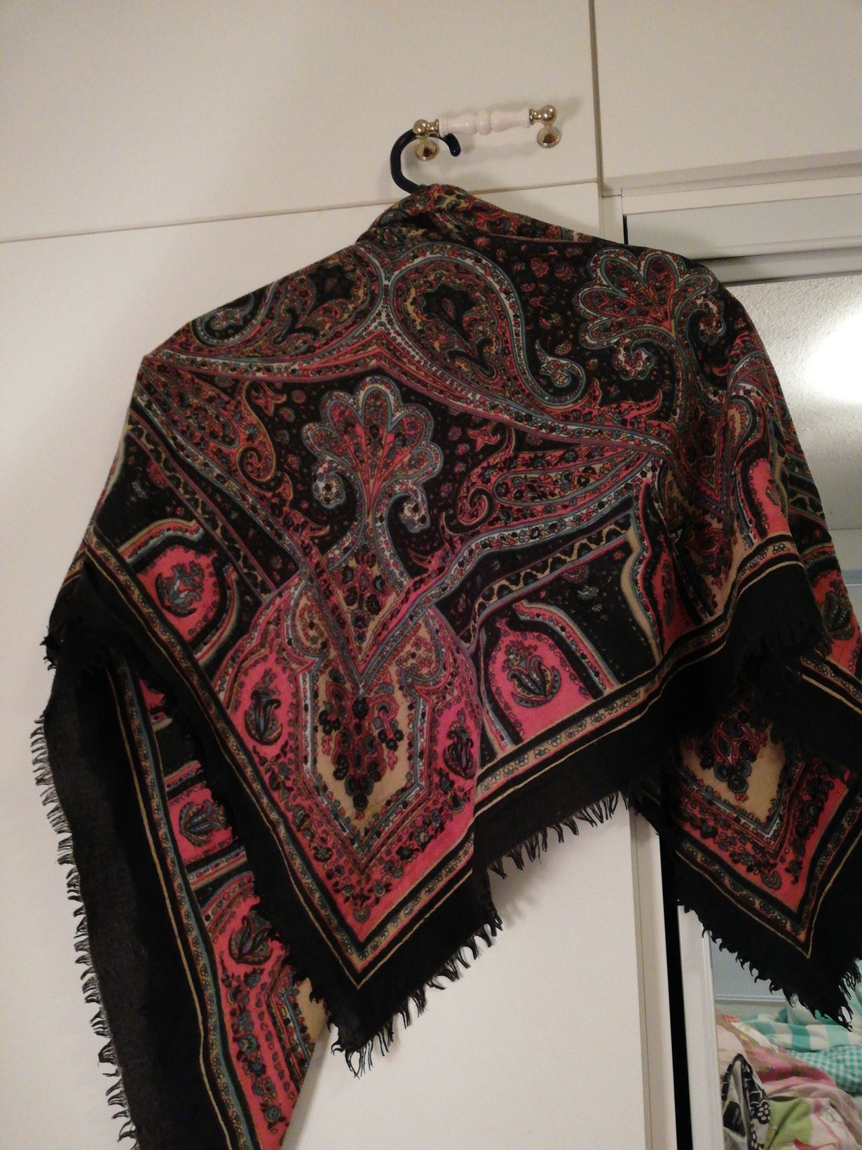 Sain tämän huivin äidiltäni noin 27-28 vuotta sitten lukioaikana. Se on toiminut useamman kerran myös omien lasten peitteenä reissuilla. Edelleen käytössä koko kylmän ajan kaulahuivina. Kerran hävisi, mutta löytyi onneksi. Erittäin rakas ja hyvässä kunnossa.
