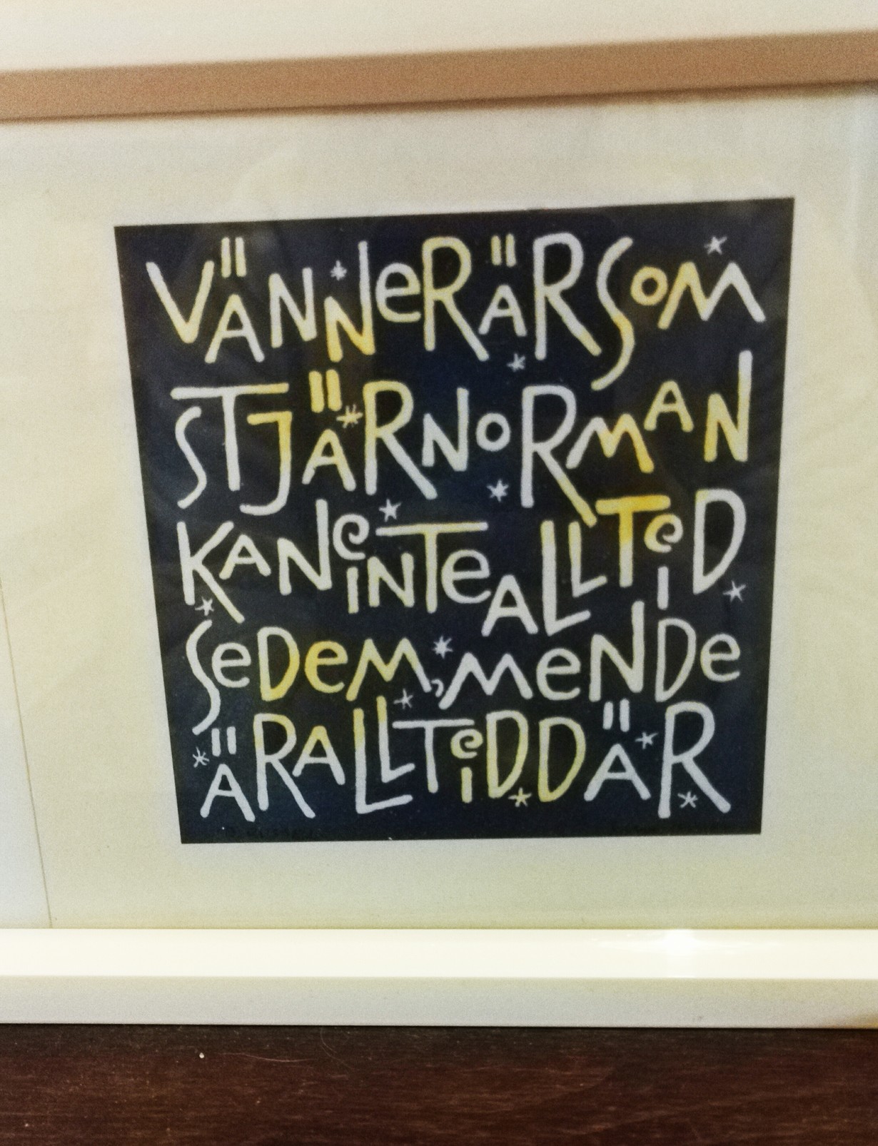 Kuvaa kotona näkyvä mietelause - voit voittaa Nespresson kahvikoneen Vänner är som stjärnor Moln 28.4.2017 klo 20:53 Mietelauseessa korostuu ystävyys ja heidän tärkeys: he ovat kuin tähtiä, niitä ei aina nää mutta ne ovat aina siellä.