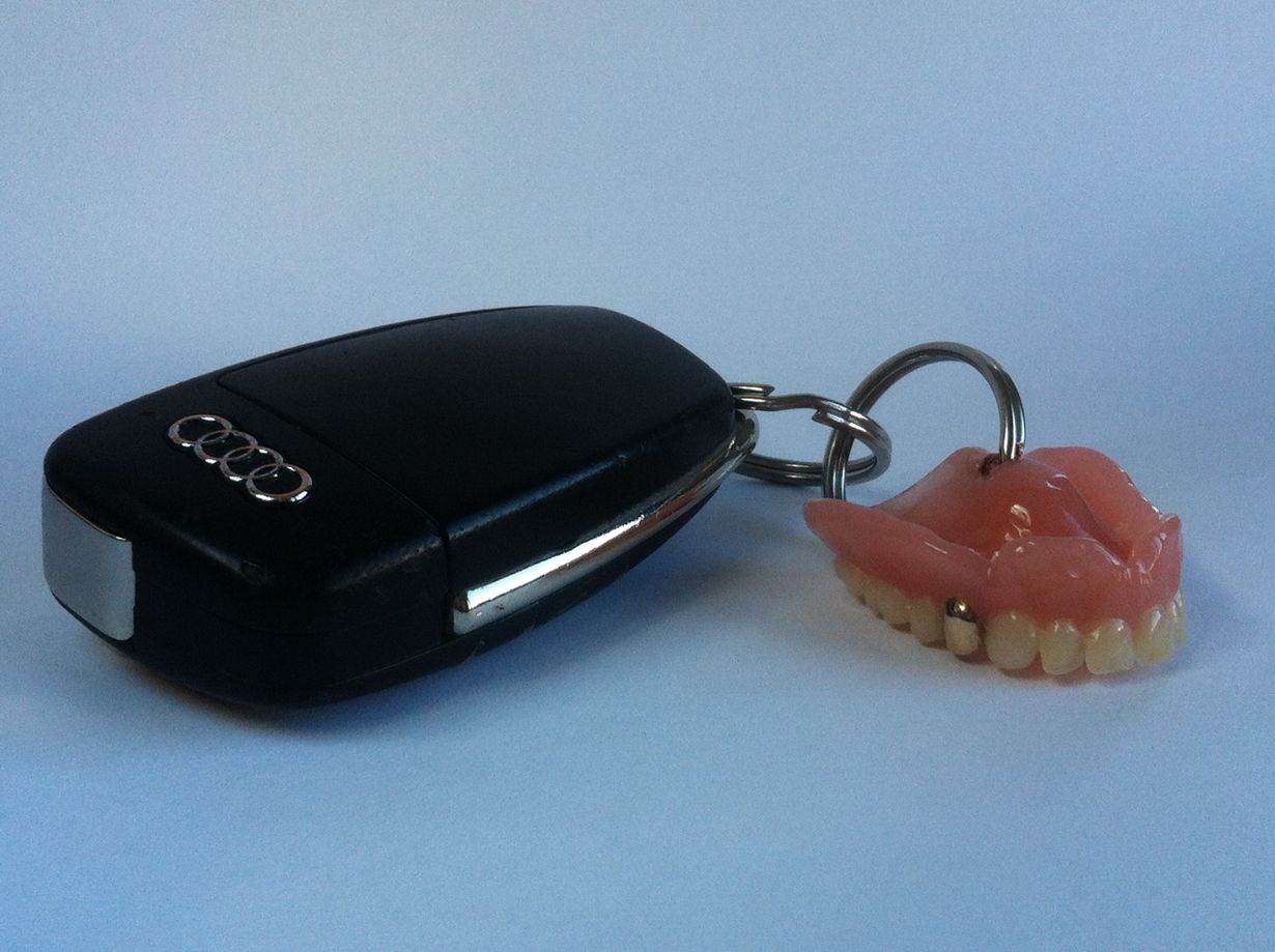 Hammaslaboratoriotyöntekijän omin pikku kätösin valmistamat pienoistekarit avaimenperänä. Kultahammas tuo vähän glamouria muuten arkiseen aiheeseen.