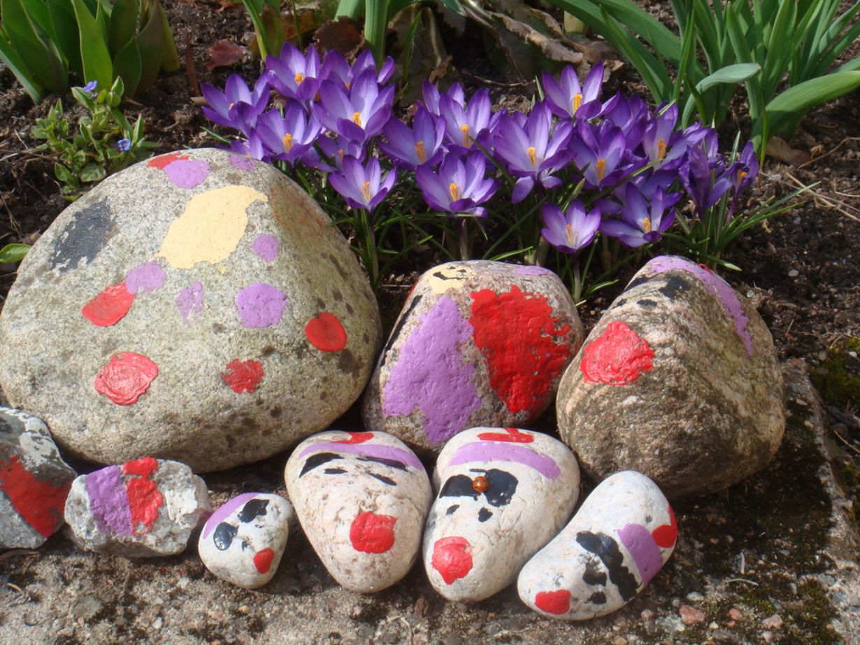 Pari vuotta sitten tyttärentytär maalasi hiiriperheen rantakivistä. Värikäs hiiriperhe ilahduttaa minua ja on hieno valopilkku puutarhassani.