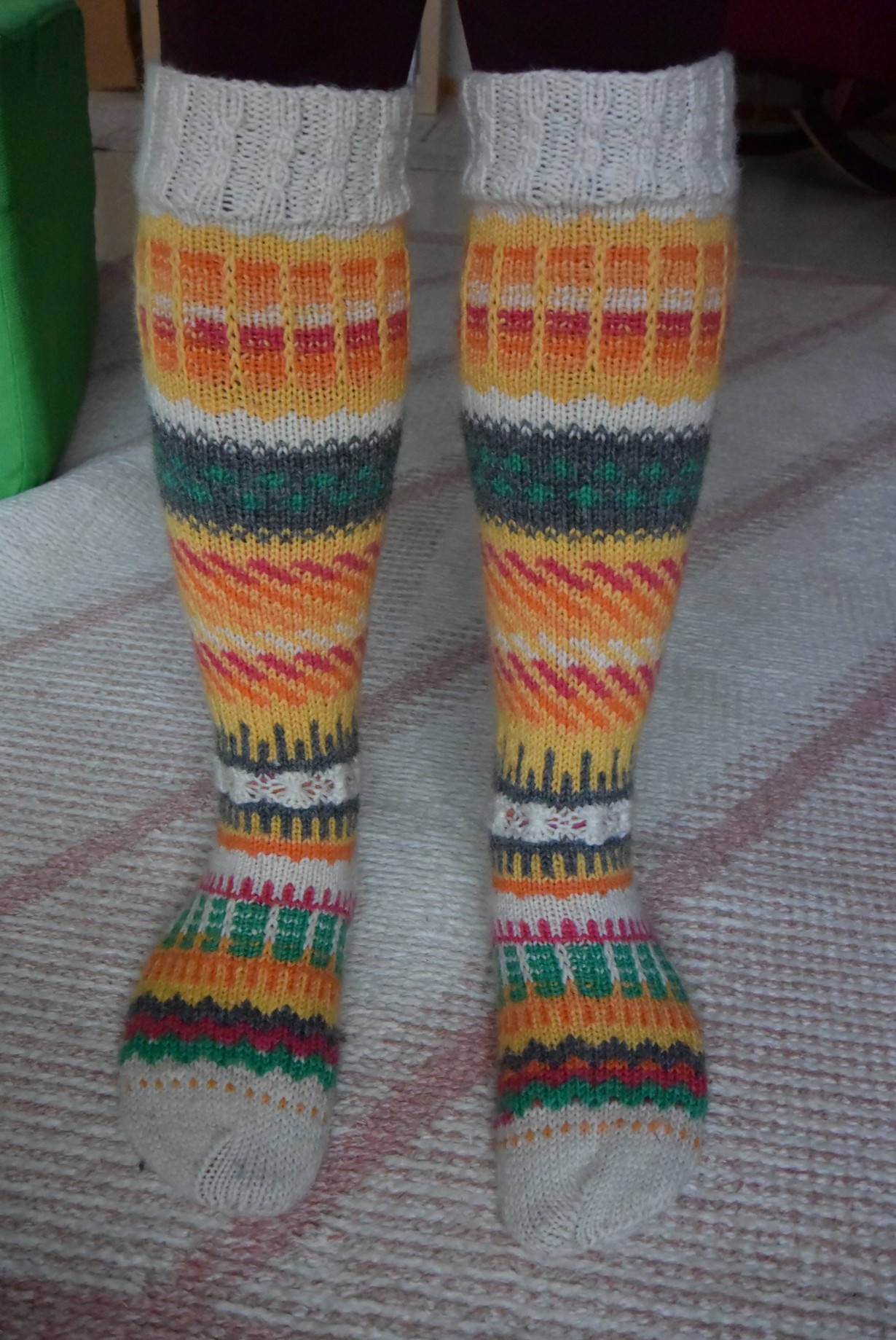 Päätin neuloa itsellenikin villasukat, yleensä neulon sukkia vain muille lahjaksi. Näistä tuli minun suosikit, silkkinauhat yläreunoista vain puuttuvat.