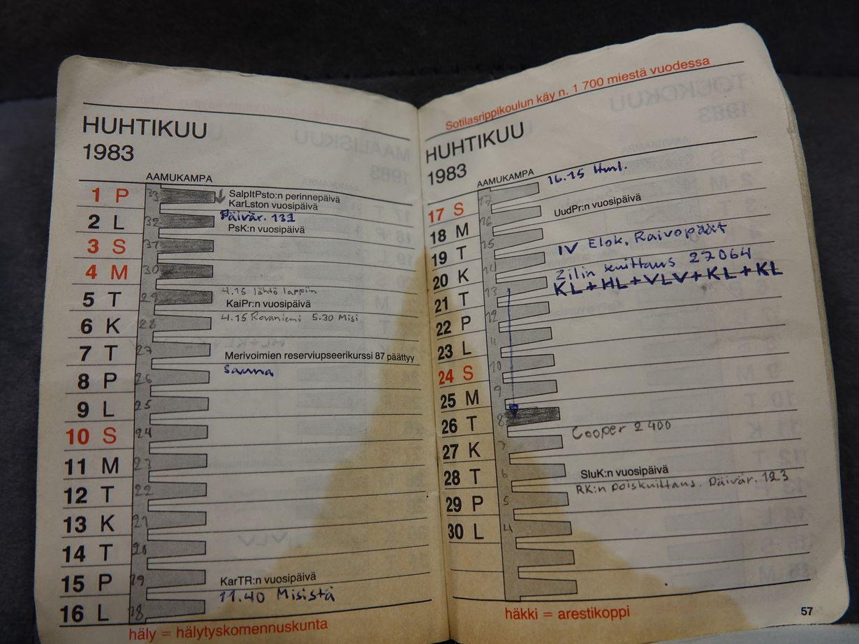 Merkintöjä tuli tehtyä 1982-83 vuosina. 11kk:n ajalta. Monia muistoja tulee mieleen selatessa tätä. Viimeinen kuukausi ennen kotiutusta kuvassa.