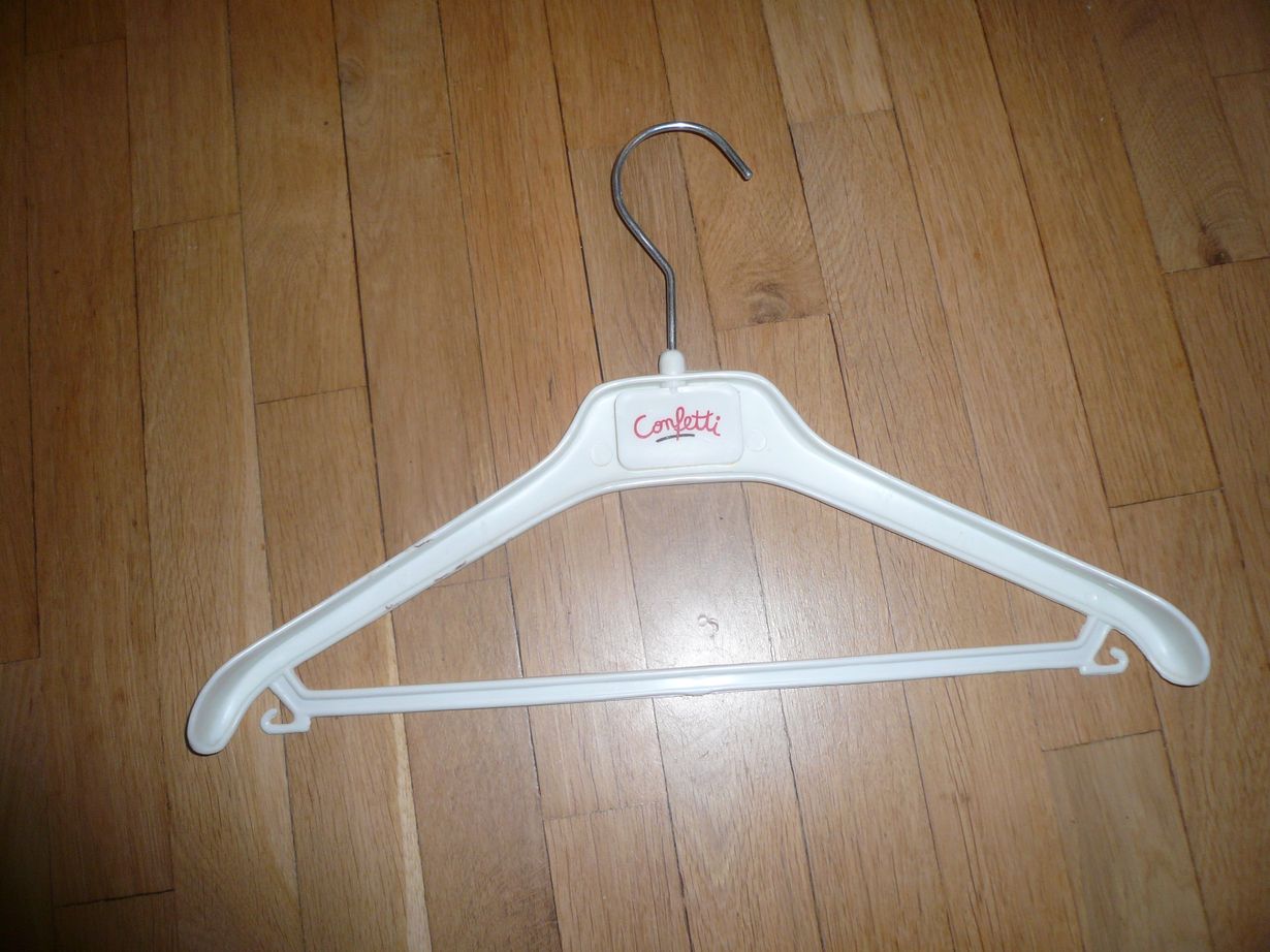 Tässä henkarissa roikkui pieni punainen kevyt toppapuku, jonka ostin "kummitytölle". En hennonut luopua siitä kun toivoin saavani pukea sen omalle tytölle piankin. Esikoinen oli poika ja se tyttö kuuman kesän lapsi. Puku meni kiertoon ilman muistoja, mutta henkari on vielä käytössä.