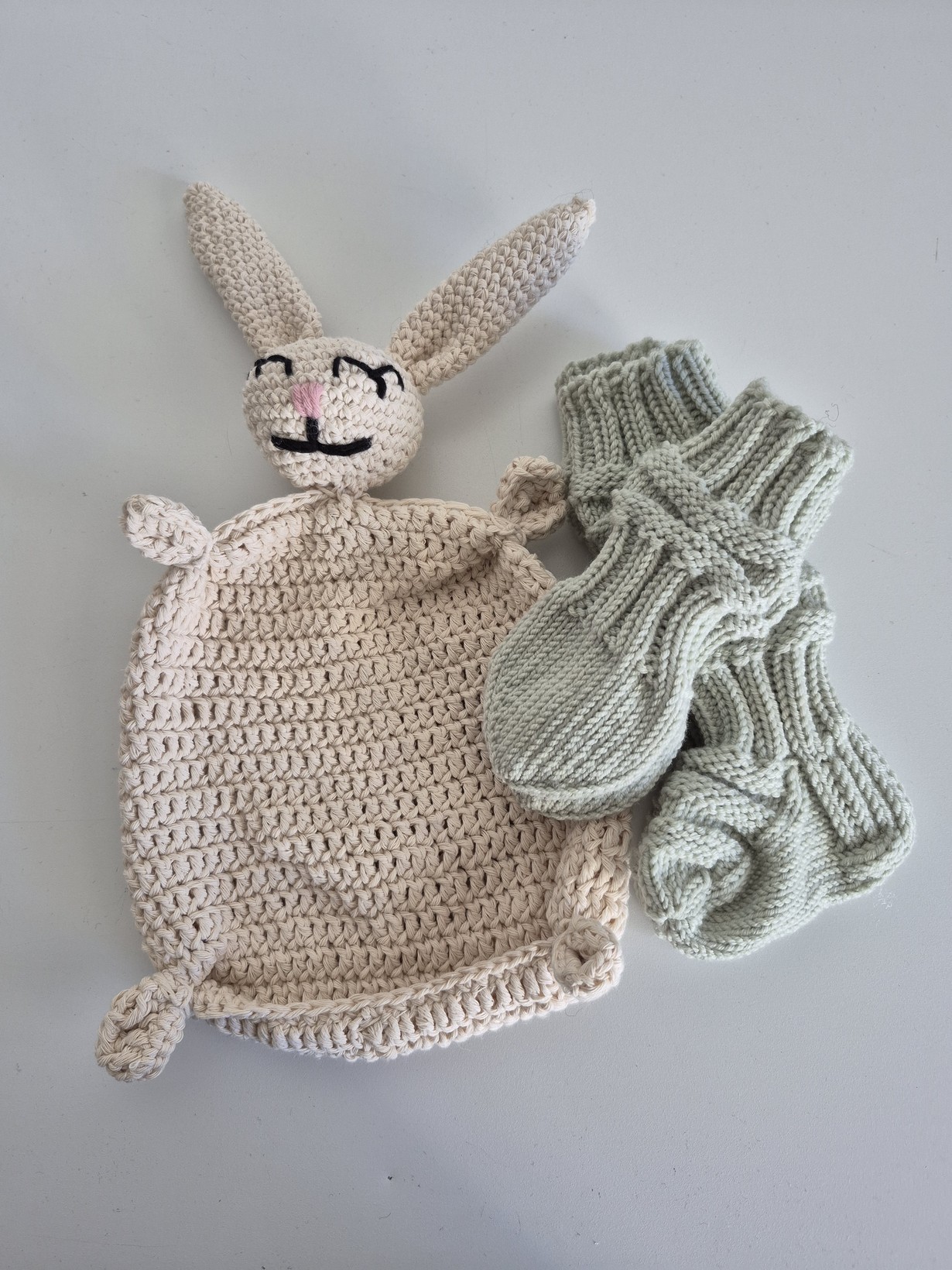 Lähetä kuvakisaan kuva lahjaksi tehdystä käsityöstä - voita Familonin pellavalakanat Vauvalle Prisca 25.9.2025 klo 15:33 Perinteiset junasukat ja tumput, sekä ihana pupu unilelu ystävän pian syntyvälle vauvalle 🩵
