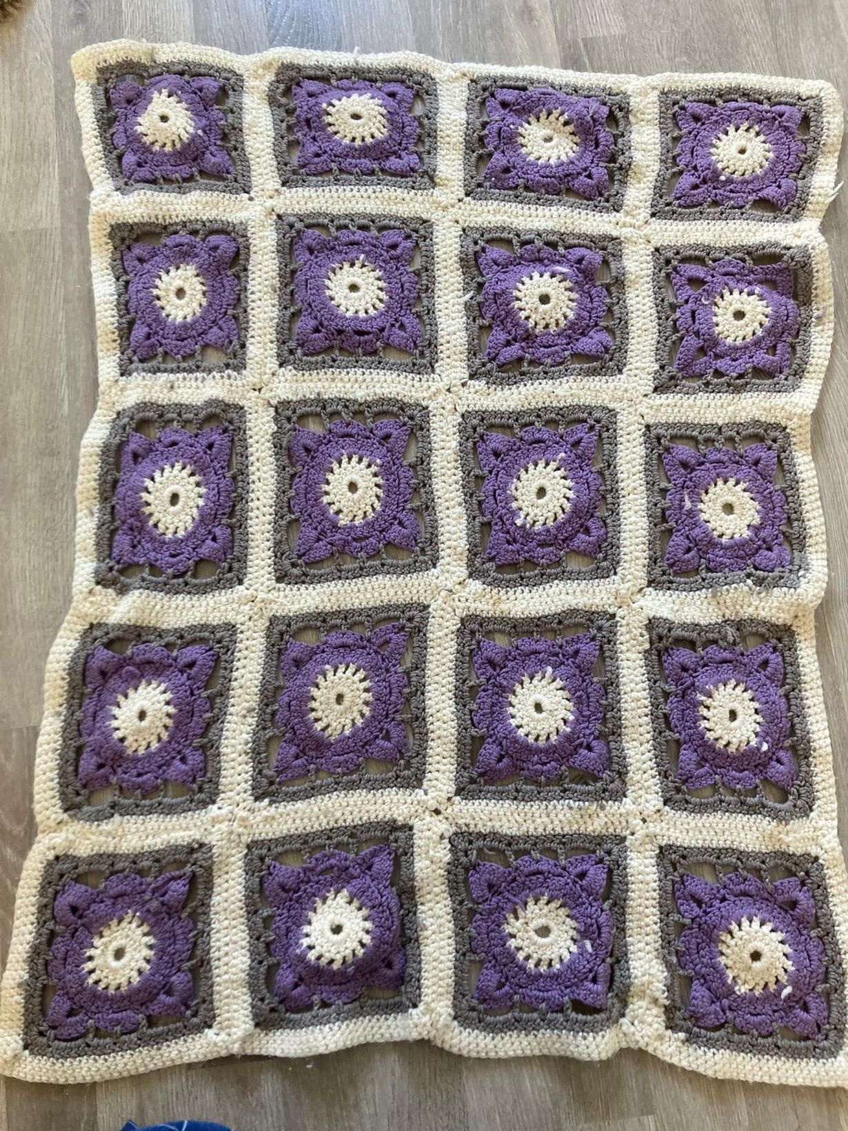 Virkkasin ensimmäiselle lapsenlapselleni merinovillalangasta lahjaksi pienen peiton. Peitto oli mukavaa virkata paloista. Se on nyt käytössä toisella lapsenlapsella.