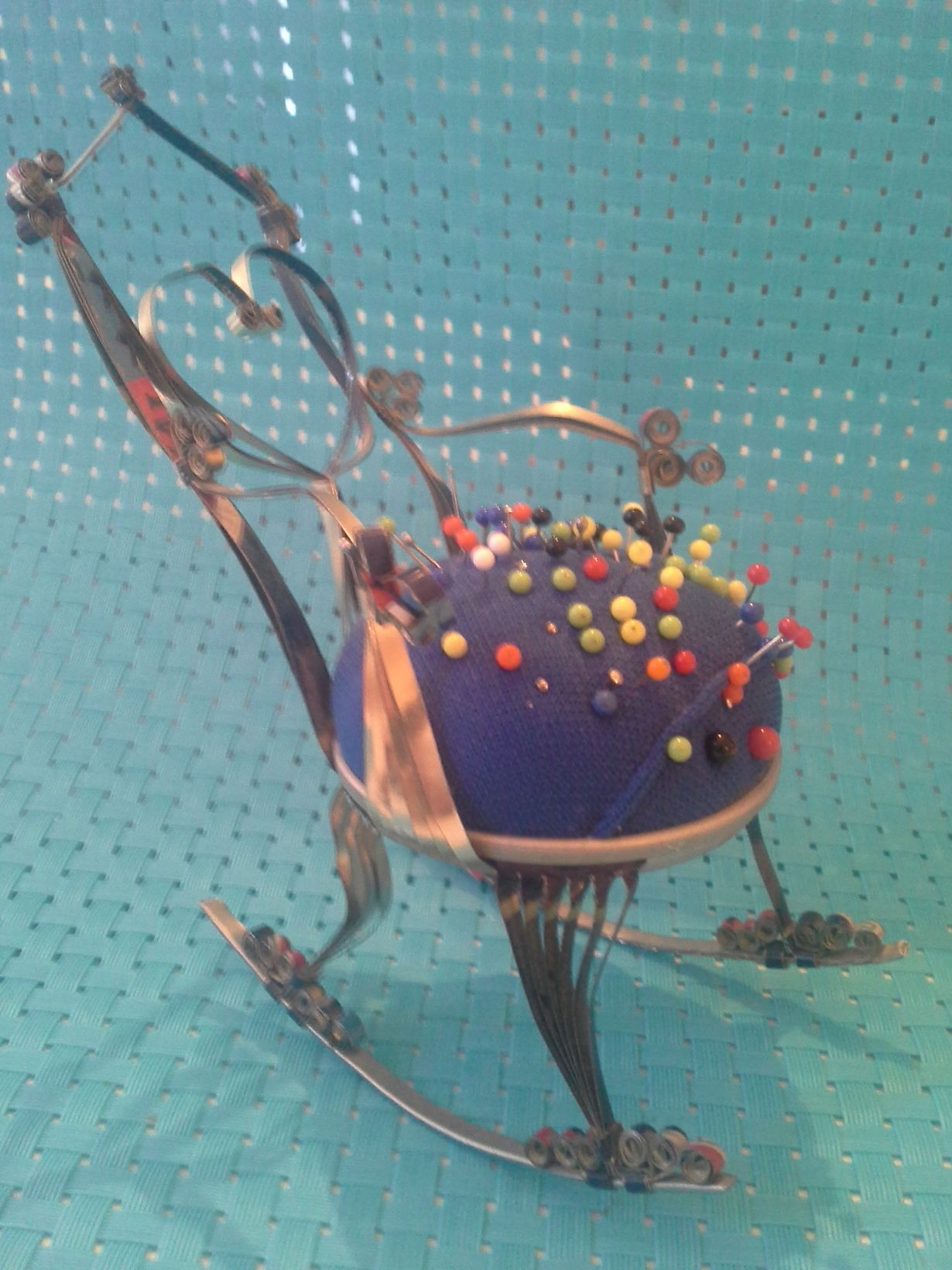 Tämän oluttölkistä taiteillun neulatyynyn olen ostanut teinityttönä sotaveteraanilta joka jo 80 -luvun alussa oli viisas mies ja osasi kierrätyksen ja uusiokäyttön. Tämä on mukanani kulkenut siis jo 33 vuotta ja uutta neulstyynyä en aio hankkia.