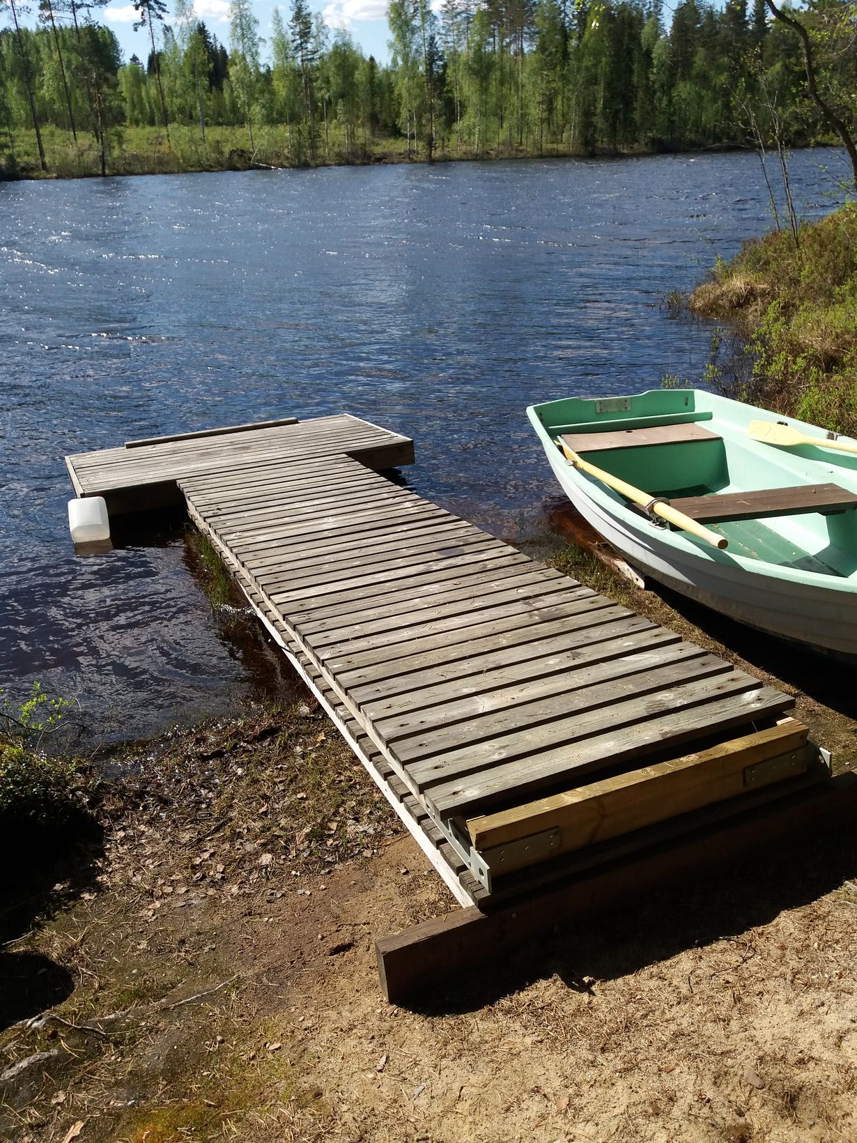Kevät tuli tänä vuonna niin vauhdilla, ettei kaikkia kevään puuhia ole pystynyt tekemään yhtäaikaa. Niinpä laiturikin odottelee vielä nipussa rannalla vesille pääsyä.