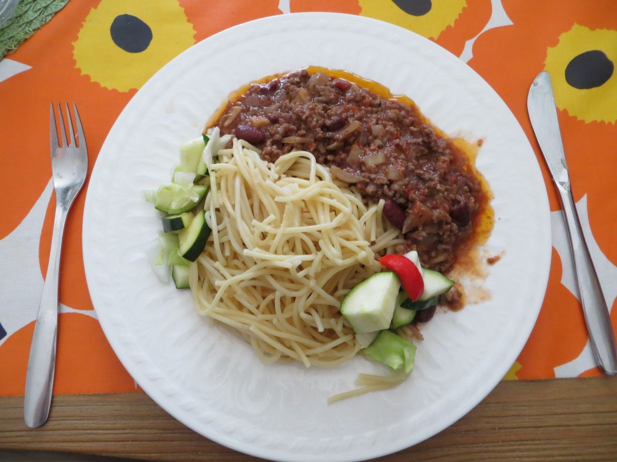 Löysin vielä naudan jauhelihaa lähimyymälästä ja tein herkkuani kera spaghetin ja punapapujen. Salaattiakin oli toki enemmän tarjolla.