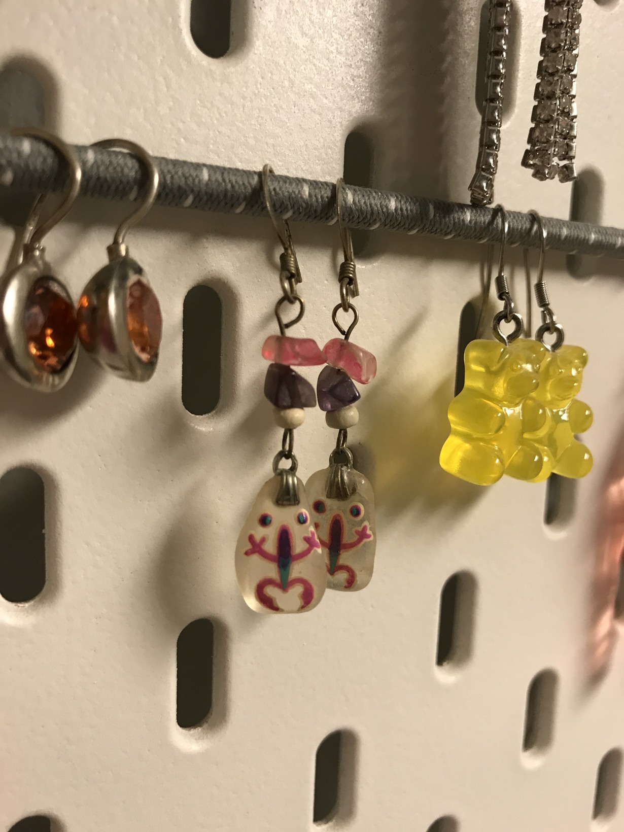 Olin kymmenen vuotta sitten vaihto-opiskelemassa Yhdysvalloissa. Spring breakilla teimme uskomattoman ihanan reissun Puerto Ricoon, ja se on yksi parhaista ja kauneimmista koskaan tekemistäni. Saaren tunnuseläin on viheltävä sammakko, coqui, ja se on maalattu näihin valtameren hiomiin lasipaloihin. Käytän korviksia vieläkin usein, ne muistuttavat tuosta huolettomasta ja seikkailuntäyteisestä ajasta elämässäni.