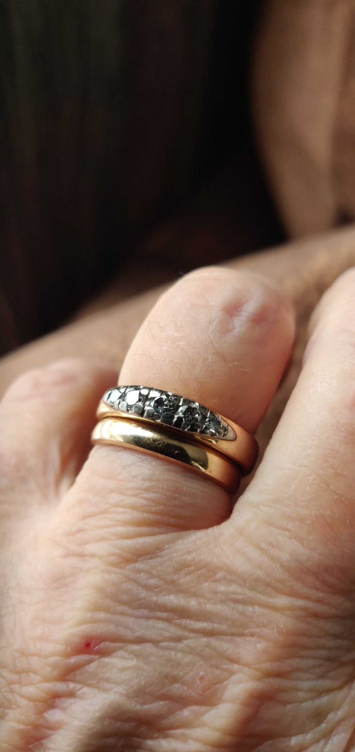 Vanhin koruni on edesmenneen anoppini vihkisormukseksi antama sormus, jossa on kaiverrus vuodelta 1921. Ostin timantit, jotka istutettiin sormukseen.