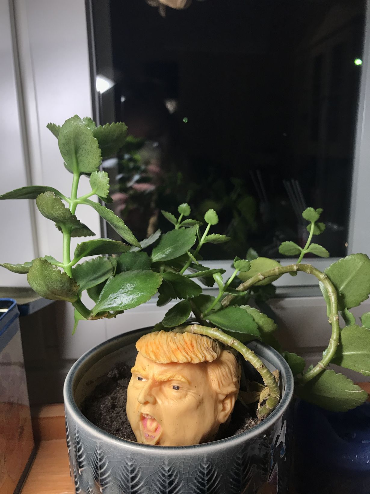 Ostin Trumpin pään muotoisen stressipallon lieventämään lukion koeviikkoja. Taisin kuitenkin moukaroida kapistusta liiankin innokkaasti, nimittäin kolmen päivän kuluttua se poksahti rikki. Kiertotalouden periaatteita kunnioittaen täytin tyhjentyneen stressipallon mullalla ja istutin Trumpin päähän vihreämpiä ajatuksia. Nyt kasvatan Trumpista ikkunallani vihreämpää ajattelijaa.