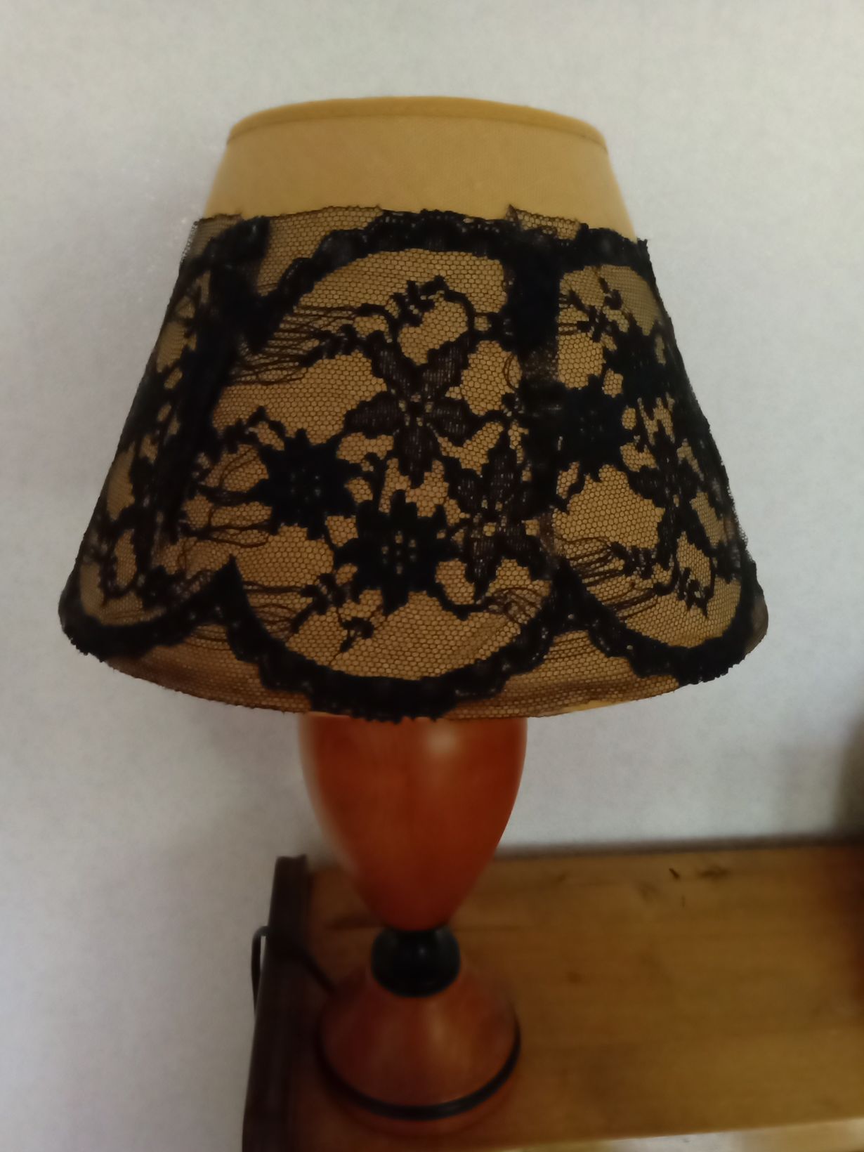 Ostin kirppikseltä edullisen lampun, jonka varjostimen väri ei alkujaankaan miellyttänyt. Keksin liimata leveää mustaa pitsiä varjostimen reunaan. Pitsi löytyi jonkin kangaskaupan alelaarista kauan sitten. Oli ollut säilössä tulevaa varten.