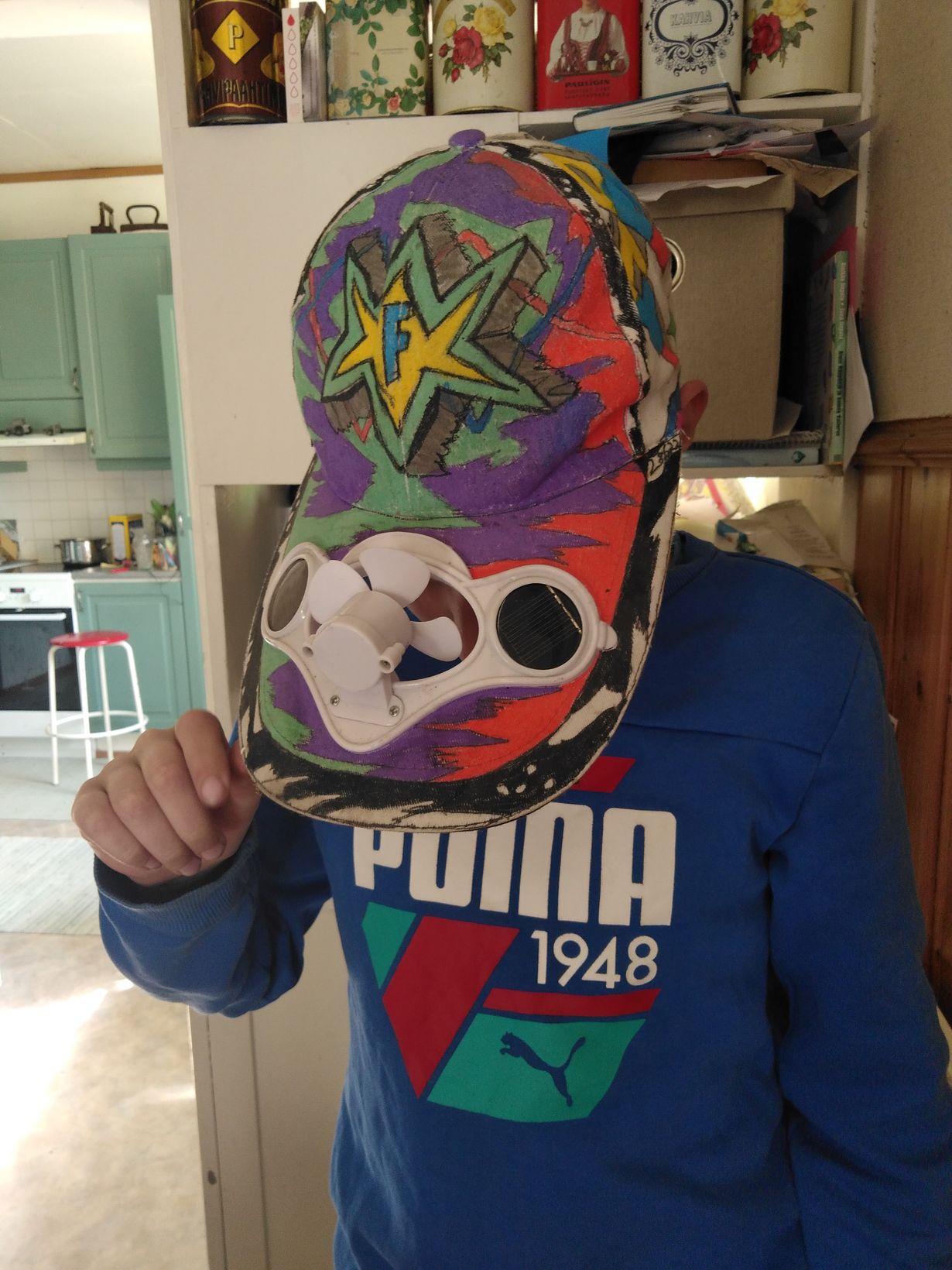 Sain pojalleni vuosia sitten aurinkokennollisen lippalakin, joka auringon voimalla pyörittää lippiksen edessä olevaa propellia ja viilentää käyttäjäänsä. Vuosi sitten valkoinen lippis ei enää ollut niin valkoinen. Ostin kangastussit ja poika itse suunnitteli ja toteutti uuden koristelun. Autoon vain kangastussin kiinnittämisestä silittämällä. Ei tule toista samanlaista vastaan!