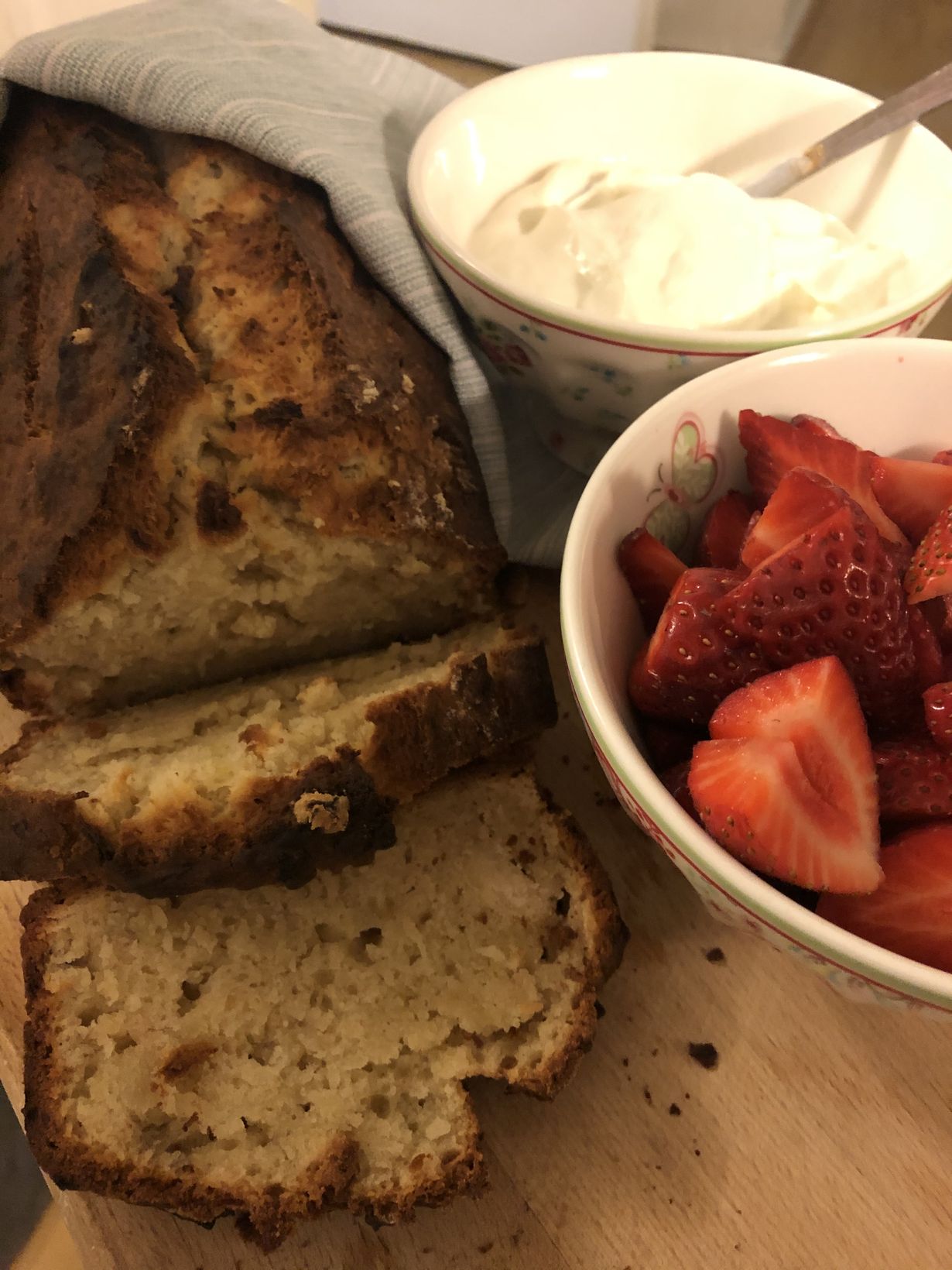 Halusin tehdä aviomieheeni vaikutuksen myös leivontataidoillani. Kermakakut ja raparperipiirakat eivät tuottaneet toivottua vaikutusta, mutta sen teki banaanileipä, luonnonjugurtin ja tuoreiden mansikoiden kera!
