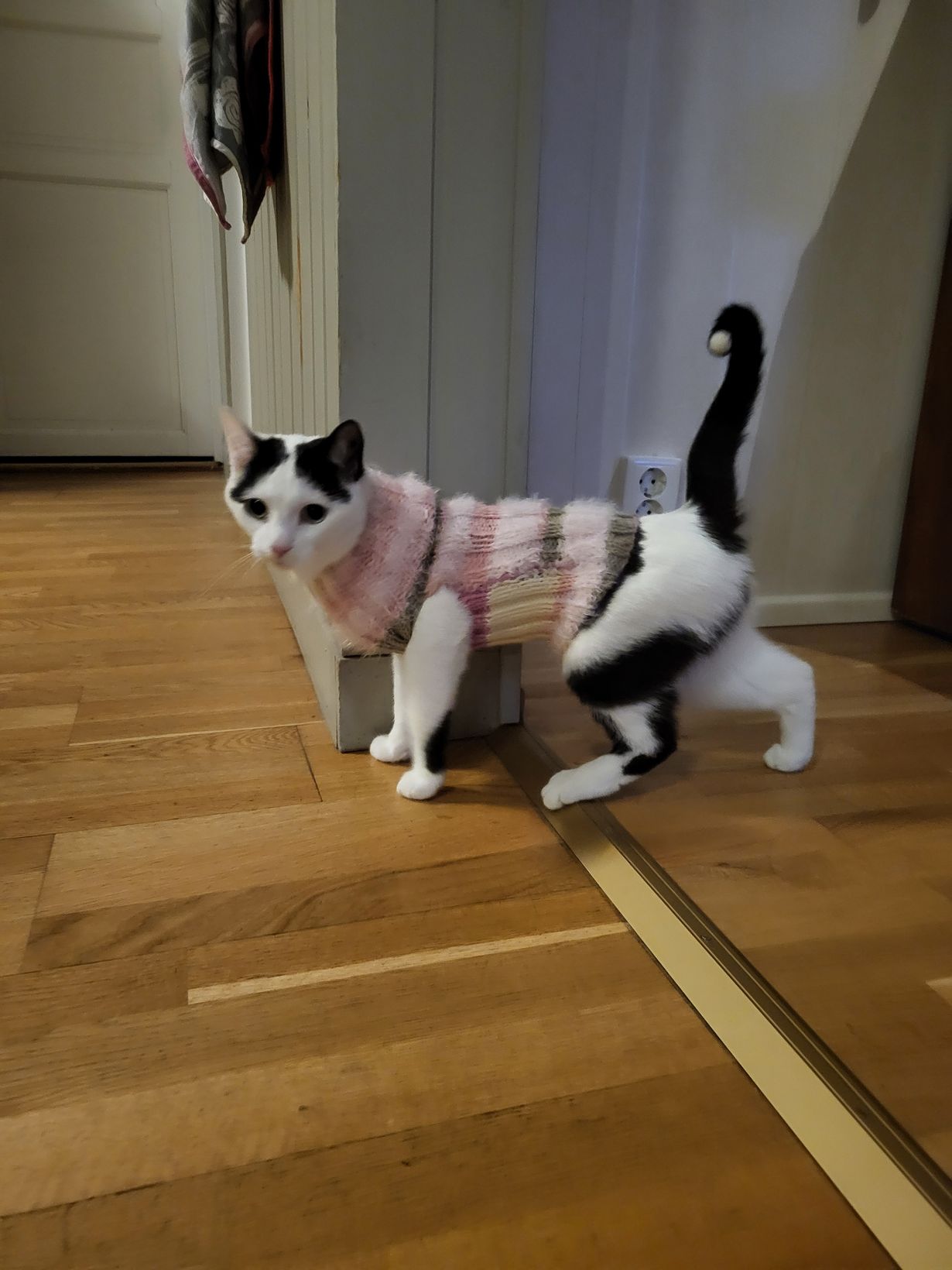 Harmi kissa rakastaa ulkoilla koirakaverien kanssa. Mummon kutomo villapaita mahdollistaa ulkoilun kylmemmälläkin säällä!