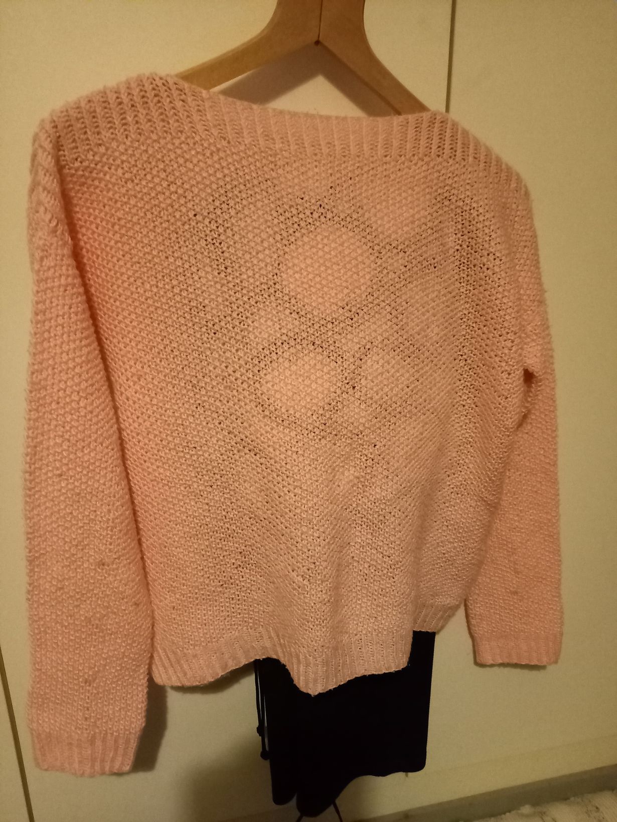 Yli 30 vuotta sitten omin käsin kudottu helmiäisneule,jonka voi yhdistää monen vaatteen kanssa.Esim mustat housut.