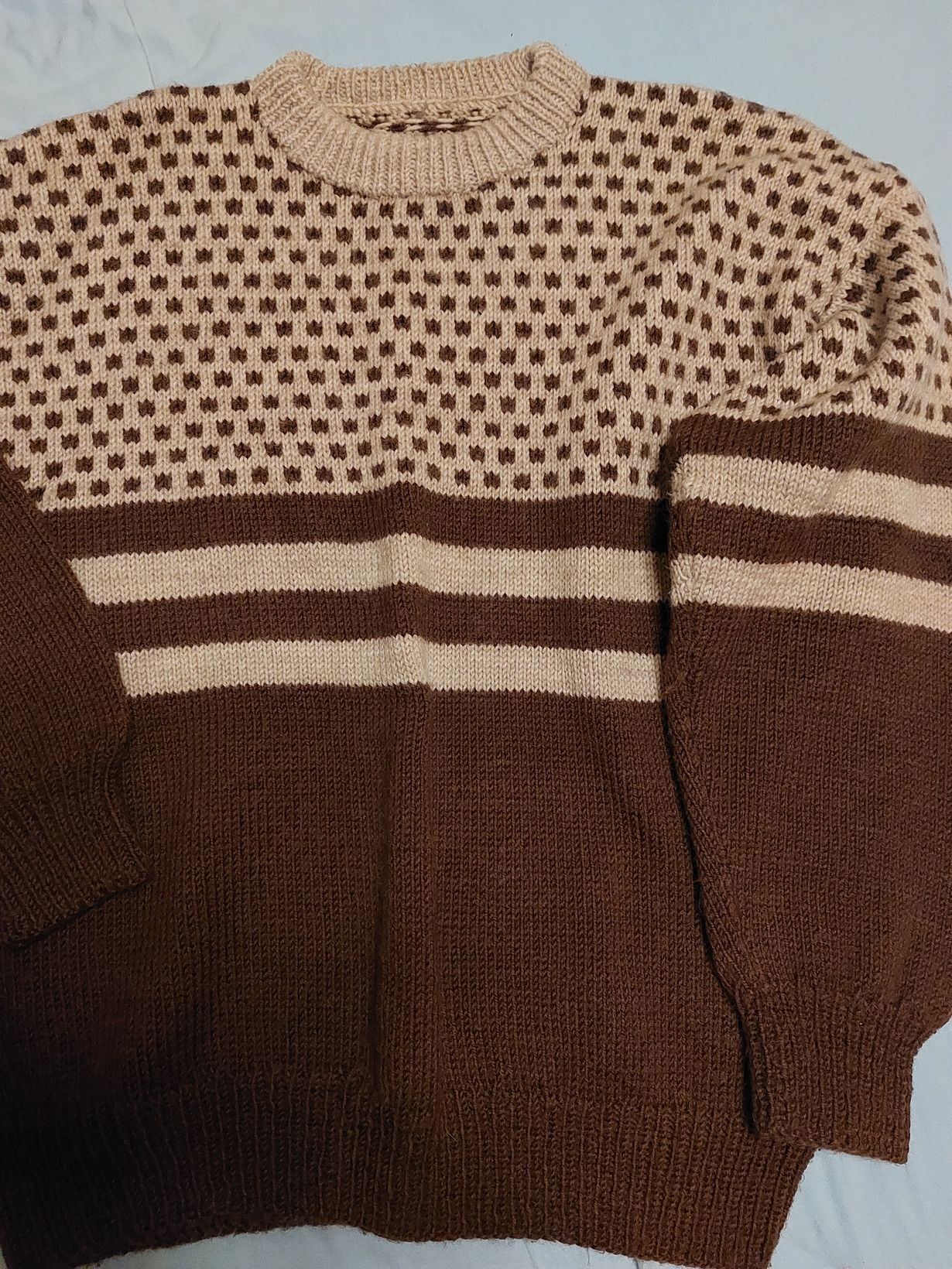 Viimeinen kutomani villapusero. Olkapäävamman takia jäi kutomiset, harmittaa.