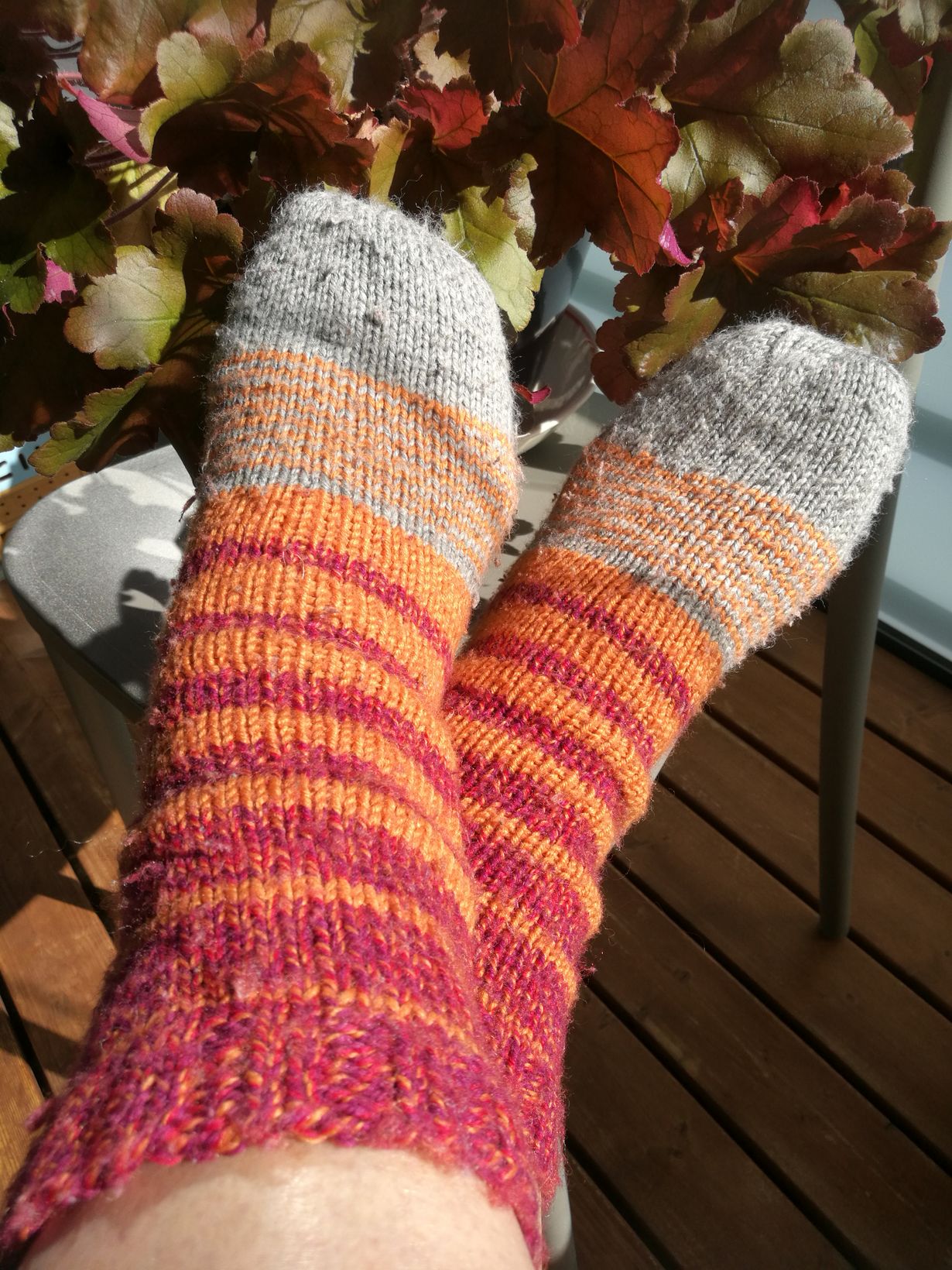 Jäätyäni eläkkeelle neljä vuotta sitten, sain työkaverilta kutomansa ihanat villasukat. Nyt uudistin terät harmaalla, jotta voin nauttia näistä edelleen ja muistaa niiden antajaa.