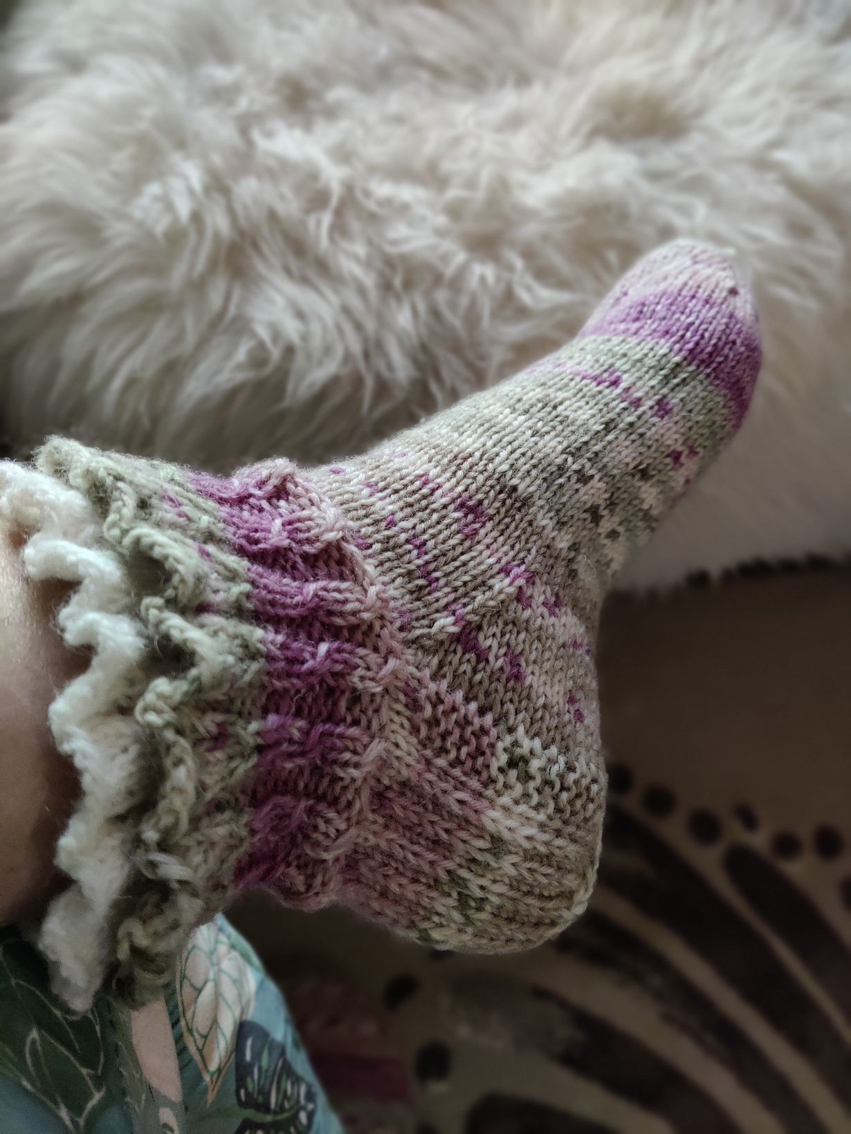 Kesän ensimmäinen pitkä purjehdus. Lähtö Kööpenhaminasta, ensimmäinen pysähdyspaikka Bornholm, jossa käsityöliikkeen alekorissa tämä hempeänvärinen lanka suorastaan huuteli haluavansa hempeiksi röyhelösukiksi. Ja sellaiset kesäsukathan niistä sitten tuli.
