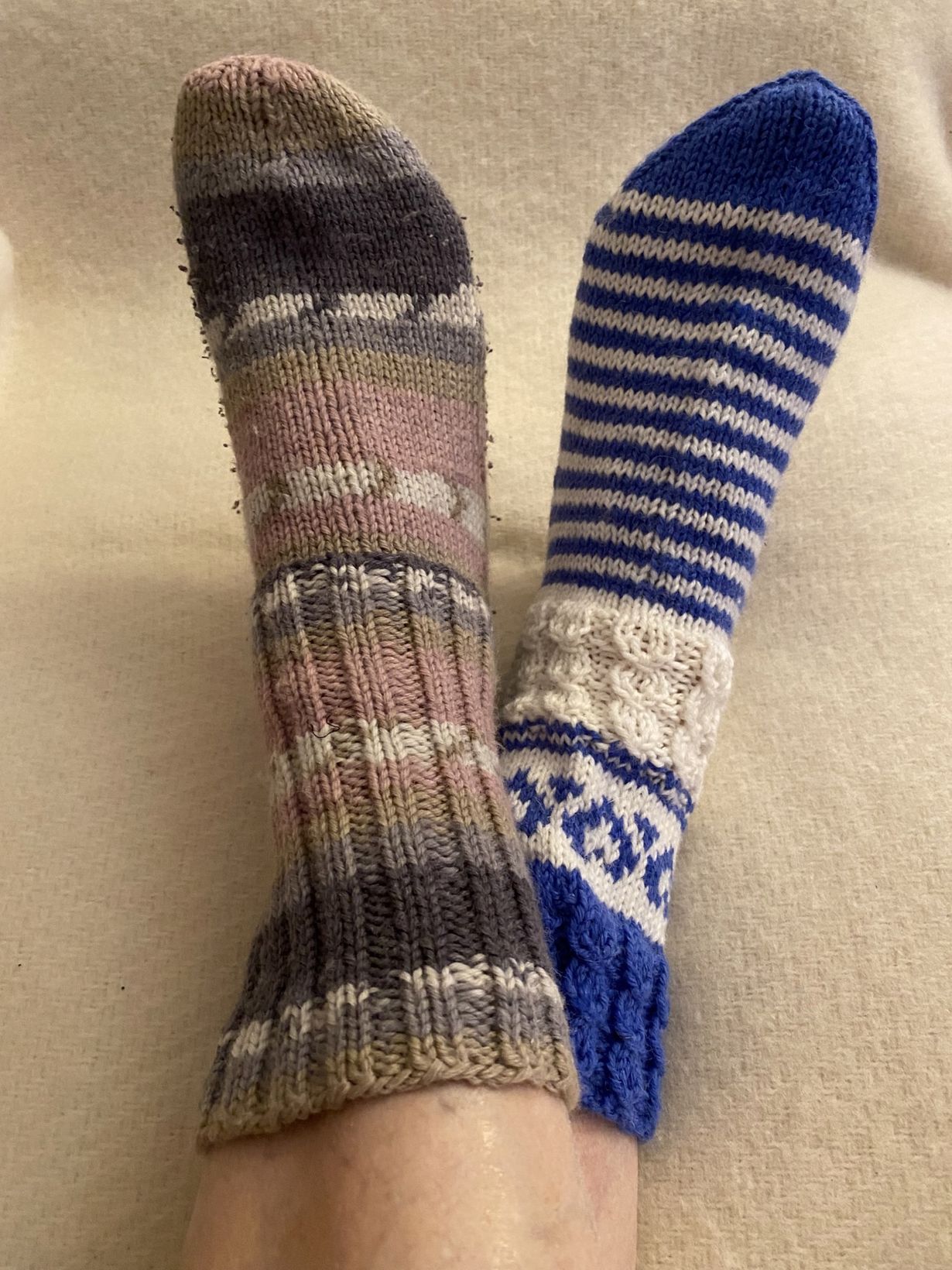 Nämä kahdet ihanat,erilaiset sukat lämmittävät jalkojani. Vasemman puoleisen on tehnyt yllätyksenä pikkusiskoni korona-ajan iltapuhteena. Oikeanpuoleinen sukka on ostettu hyväntekeväisyyskampanjasta tämänkeväisten MM-kisojen aikaan Tampereelta paikallisen Mummon kammarin osaavien käsien kutomana. Erityisesti sukkien sinivalkoinen väri herätti huomioni ja kauniit kudontakuviot.