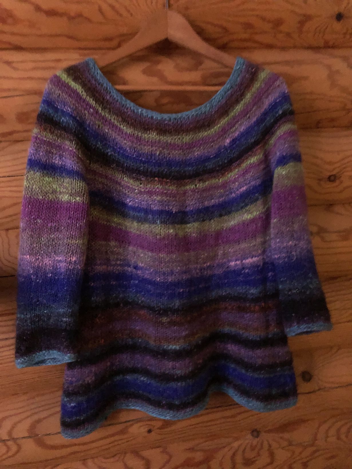 Villapaita Japanilaisesta käsinvärjätystä ja kehrätystä langasta. Oli ensin villatakki, jonka etureunat ompelin yhteen selkäpuolelle, taas mahtuu.