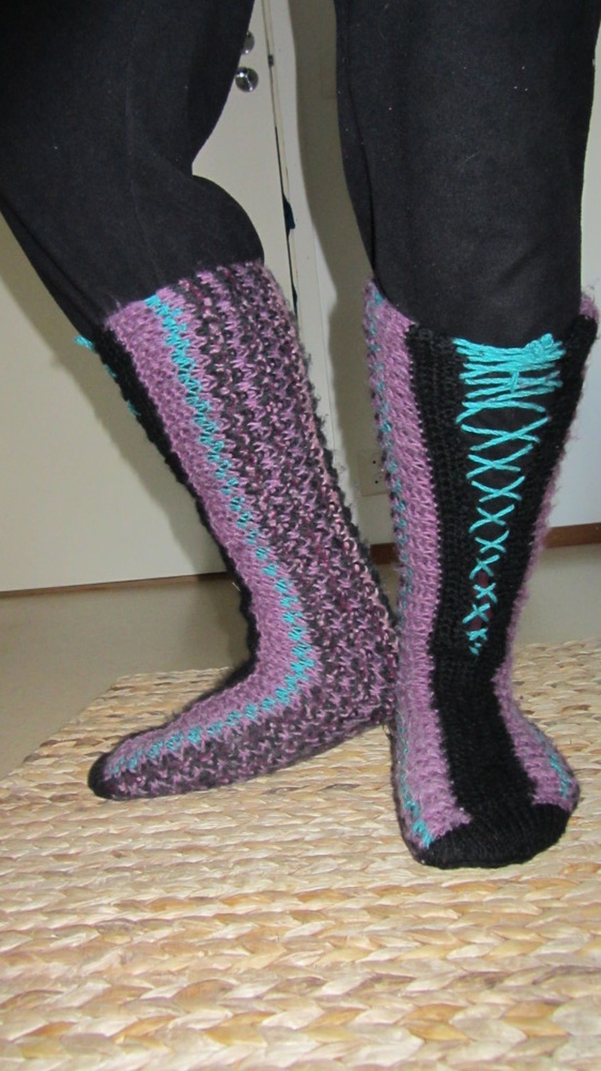 Ystäväni kutoi minulle villasukat lämmittämään palelevia varpaitani. Koska hän ei ollut varma jalkani koosta, joka onkin melkoisen suuri, hän teki minulle putkisukat ilman kantapään paikkaa. Jotta sukat eivät valuisi koko ajan makkaralle, ystäväni kehitti niihin vielä kiristettävät narut. Varpaani kiittävät :)
