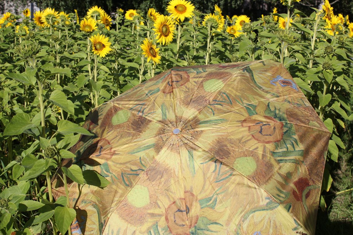 Ostin Amsterdamista auringonkukkia aiheisen sateenvarjon. Kuosi on peräisin Vincent van Goghin maalauksesta. Tämä on piristänyt sadekelejäni. Nyt varjo lataa kukkiinsa virtaa auringosta.