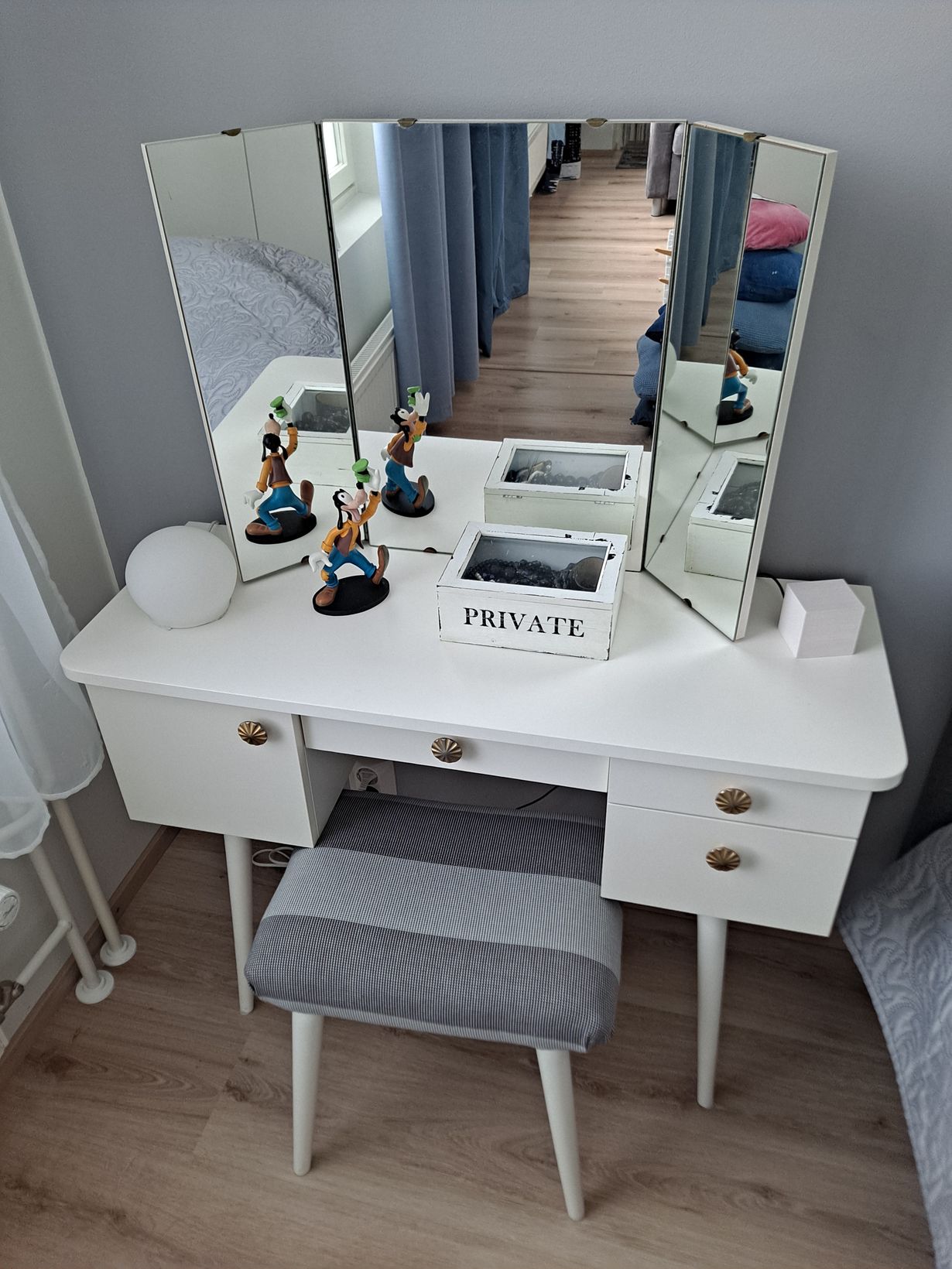 Mummon peilipöytä tuli somistamaan omaa pientä asuntoani hänen poismenonsa jälkeen. Samalla se muistuttaa rakkaasta isoäidistäni ja lapsuuden "hieno neiti" leikeistä pöydän ääressä.