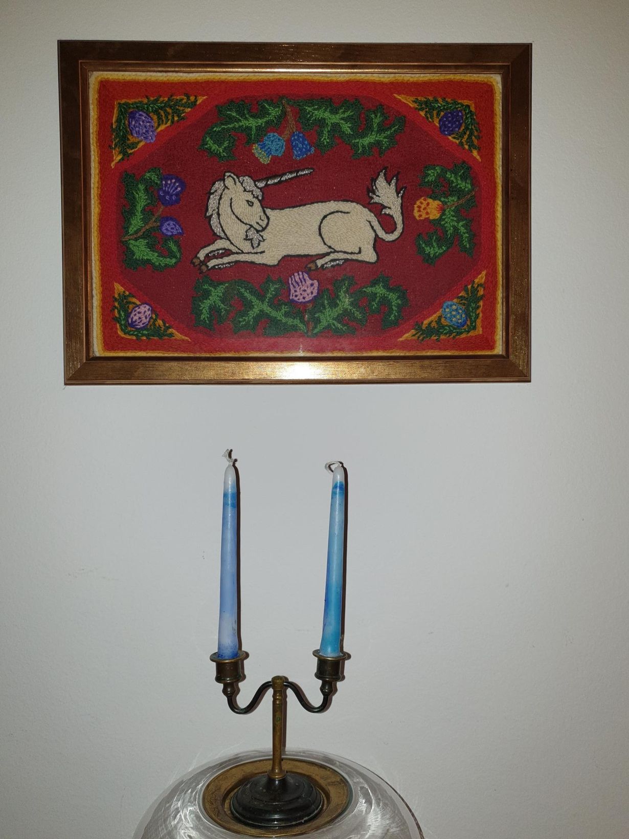 Taulu on siskoni tekemä (Amerikassa) jonka alla seisoo Kynttiläjalka (vuosikerta tuntematon). Veljen tyttäreltä saadut sinertävät kynttilät (käsinvaletut Australiassa) koristavat hyvin.