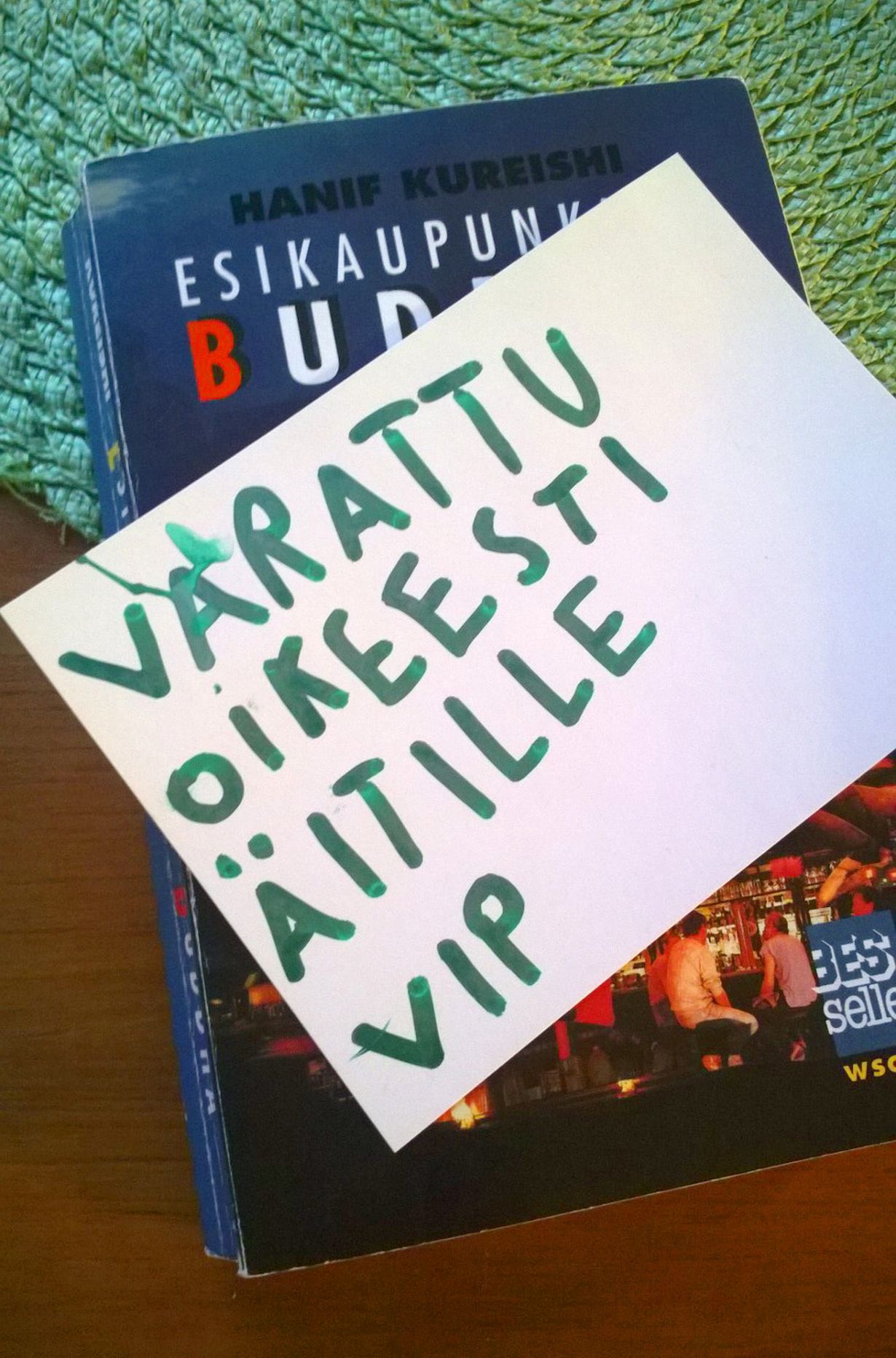 Pidettin lauantai-leffailtaa ja lapset askartelivat jokaisen istumapaikalle tällaiset laput, joissa luki kenelle paikka on varattu. Ja minä sain oikein VIP-paikan :) Tämä oli niin hauska että olen säilyttänyt sitä kirjan välissä ja se on saanut toimia kirjanmerkkinä.