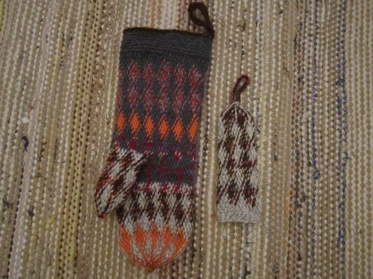 Patakinnas on toteutettu salmiakki- tai piiilosilmukkatekniikalla. Siihen sai upotettua kaikenlaisia jämälankoja, toiset kaksinkertaisina, joten kintaaseen tuli sekä vartta että paksuutta.