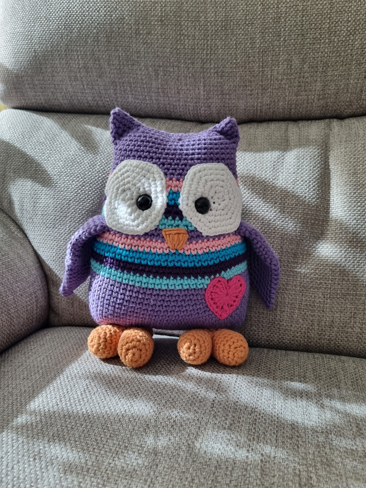 Lähetä kuvakisaan kuva lahjaksi tehdystä käsityöstä - voita Familonin pellavalakanat Virkattu pöllö kummitytölle Tiitu 25.9.2025 klo 17:52 Virkattu pöllö lahjaksi uudelle pienelle kummitytölle.