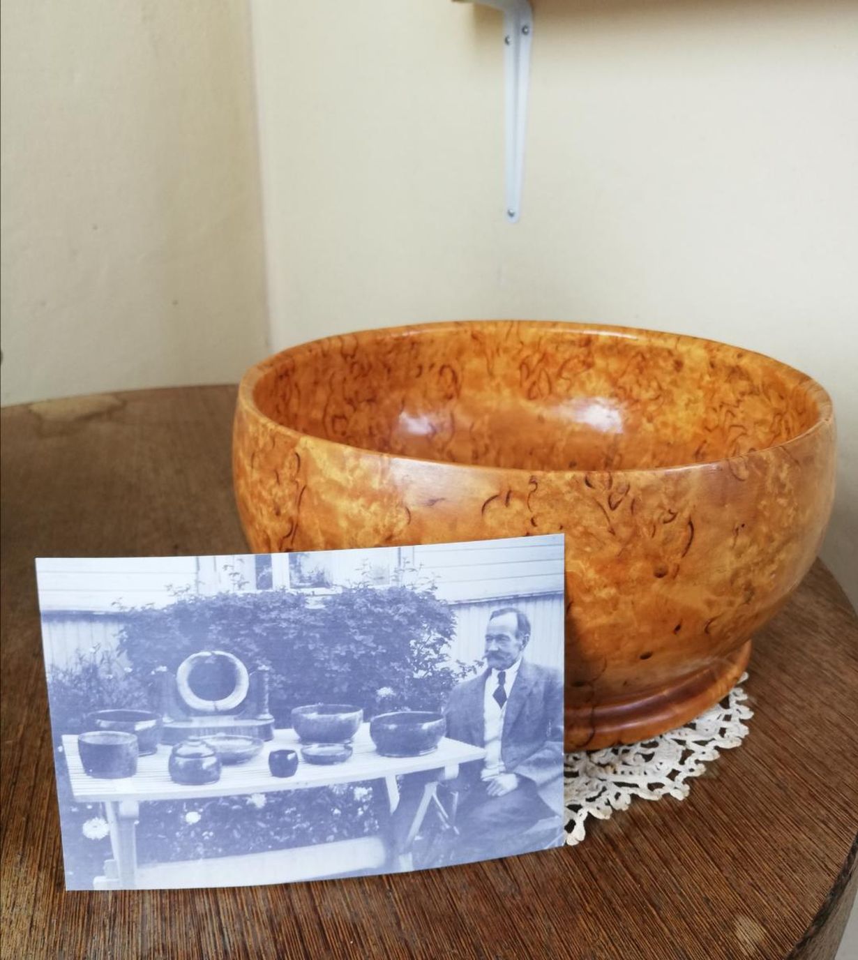 Äitini isoisä on tehnyt visakulhon Lempäälän mieskäsityökoulussa 1920-luvulla. Sattumalta vanhoja negoja kehitettäessä löytyi kuva tekijästä istumassa tekemiensä taidokkaiden visatöiden ääressä.