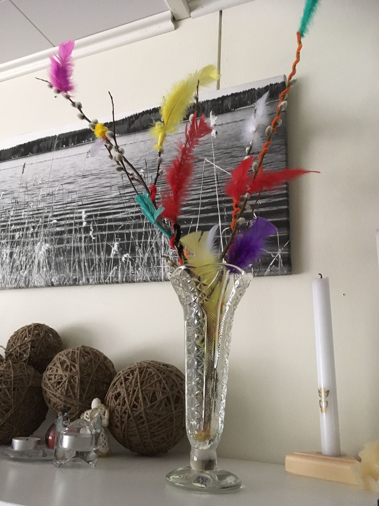 Kuvassa tän vuoden virpomisvitsoja, itse maljakon tarina onnse että 13 vuotta sitten sain esikoisen ja kastejuhlaan ostettiin samaa sarjaa maljakko, kastemalja ja kynttilänjalka. Nyt ne ovat palvelleet jo neljän lapseni ristiäisissä ❤