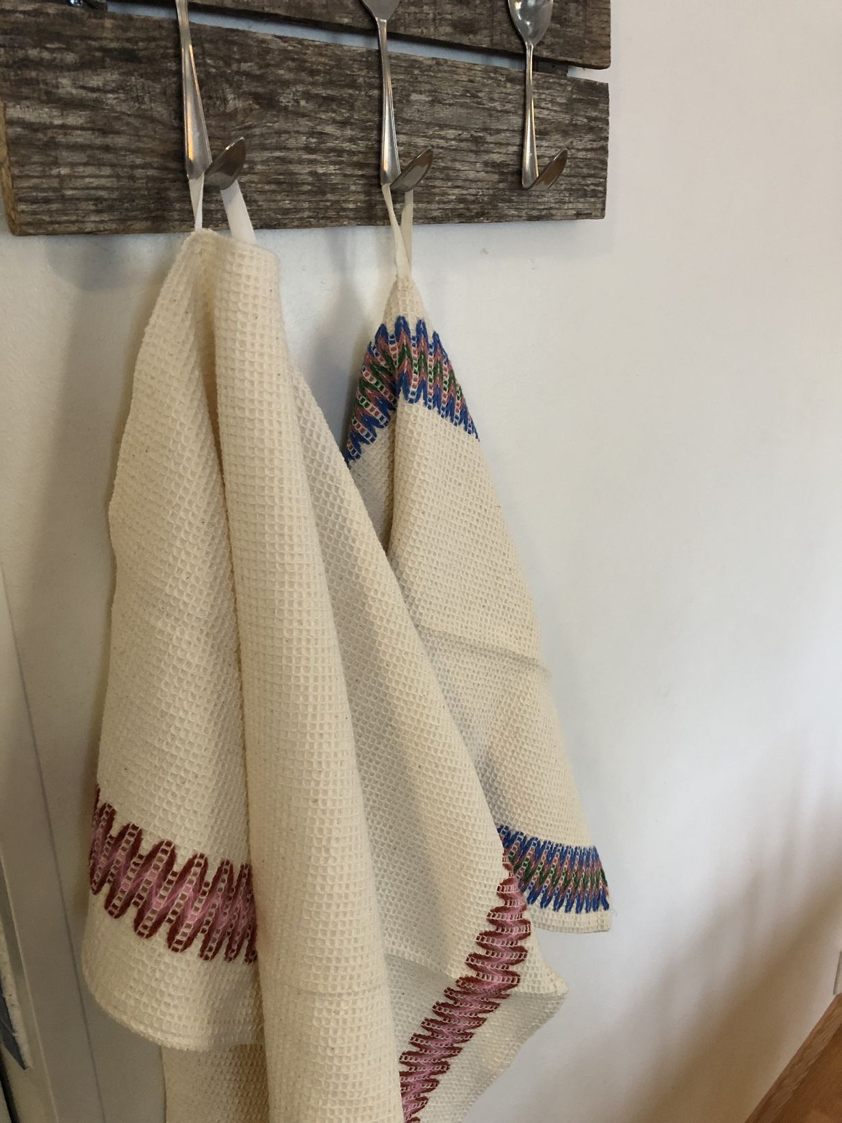 Olen aina kuvitellut olleeni tumpelo käsitöissä. Nämä äidin kätköistä löytyneet tekemäni vohvelikirjonnoin koristellut pyyhkeet todistavat toisin. Ehkä minusta voisi tullakin käsityöihminen!