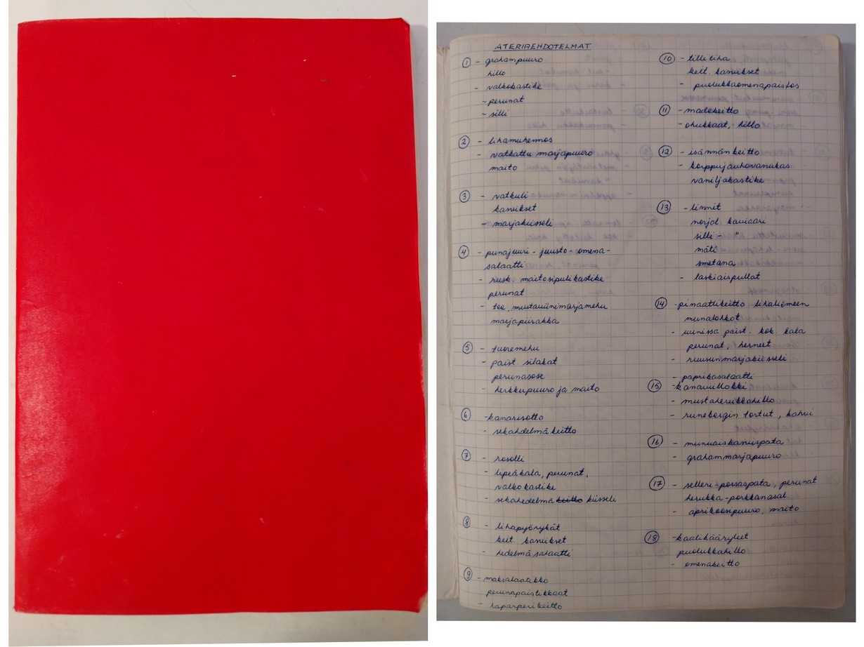 Kävin Joensuun Talouskoulun keväällä 1975. Punainen reseptivihko on tallella, ja siinä on esimerkiksi ateriaehdotelmia tyyliin: lihamuhennos, vatkattu marjapuuro, maito. Vihkoon olen myöhemmin elämässäni kirjoittanut esimerkiksi lapsuuden lempileivosreseptejä ja liimannut lehdistä löytyneitä ohjeita.