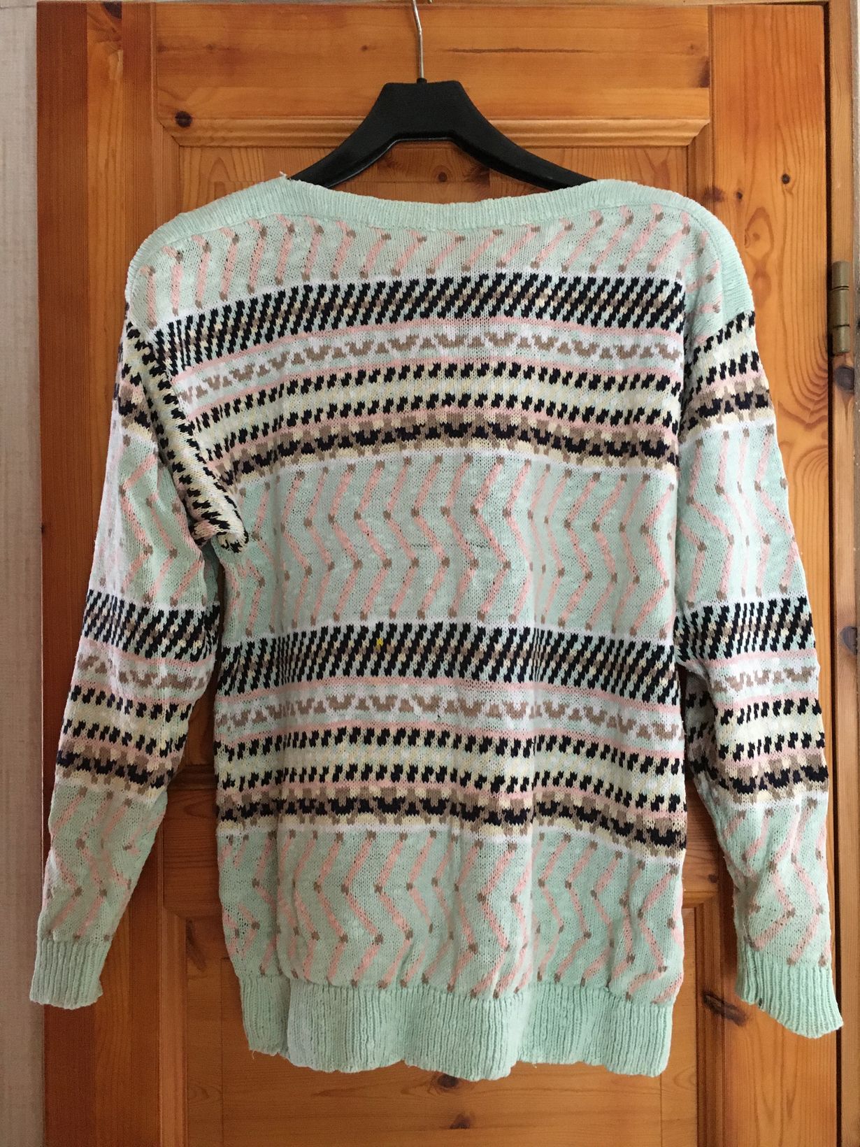 Tämä kaunokainen on majaillut vaatehuoneessani jo yli 30 vuotta. Aikanaan pidin sitä lähes joka päivä. Hihansuutkin ovat jo hieman ottaneet osumaa. Tämä vaate tuo kuitenkin niin ihania muistoja, etten varmaan koskaan malta siitä luopua. Voi olla, että se pääsee vielä joskus käyttöönkin.