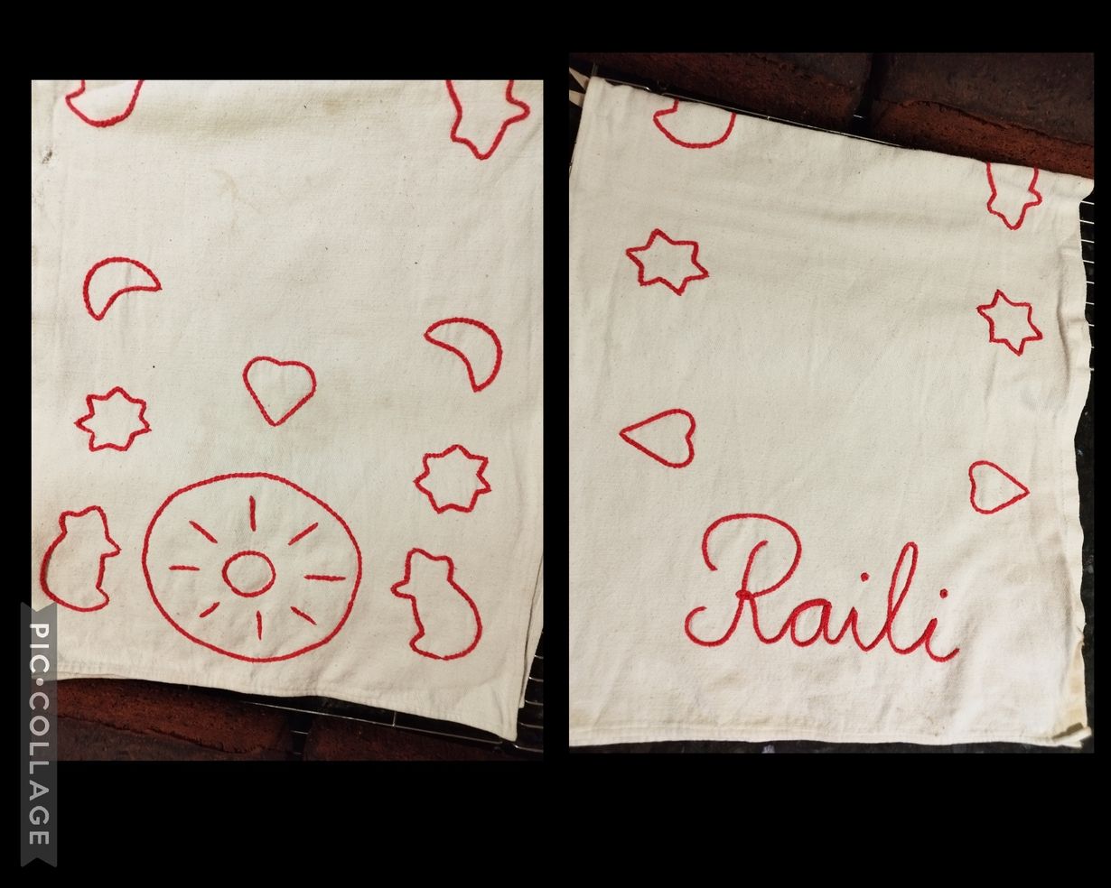 Ajan saatossa hieman kärsinyt, mutta sitäkin rakkaampi äitini kirjailema liina.