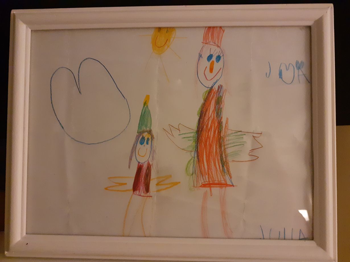 Tulin väsyneenä ja hiljan eronneena apeana töistä päiväkotiin hakemaan 4-vuotiasta tytärtäni, kun hoitaja ojensi minulle tämän tyttäreni piirustuksen. Siitä lähtien tämä voimapiirustus on ollut minulla raameissa. Aina sitä katsoessani tiedän, että elämä jatkuu vastoinkäymisistä huolimatta.