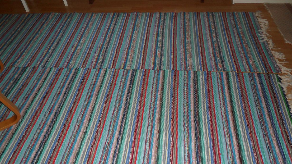 Kesänaapuri kysyi tarvitsenko käyttämätöntä pitkää räsymattoa. Ei ollut käyttöä niin pitkälle, joten tein matosta kaksi lyhyempää. Tuli juuri sopivat olohuoneen lattialle.