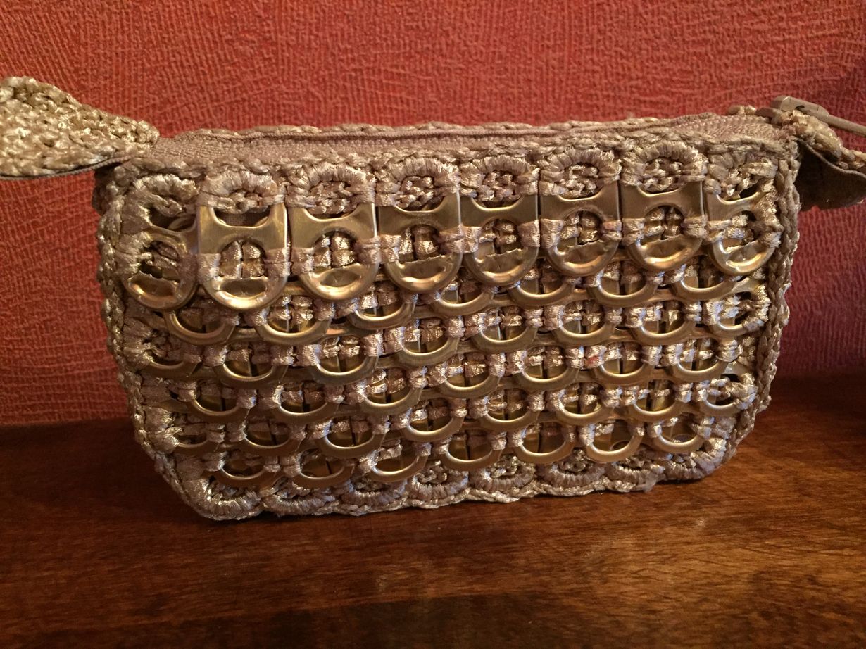 Sain meikkipussin joululahjaksi ystävältäni, joka teki sen keräämistäni oluttölkkien nipsuista. Pussin valmistu vaatii kärsivällisyyttä ja huomattavaa sorminäppäryyttä. Värinä kulta on hienostunut ja hieman erikoisempi kuin hopea.
