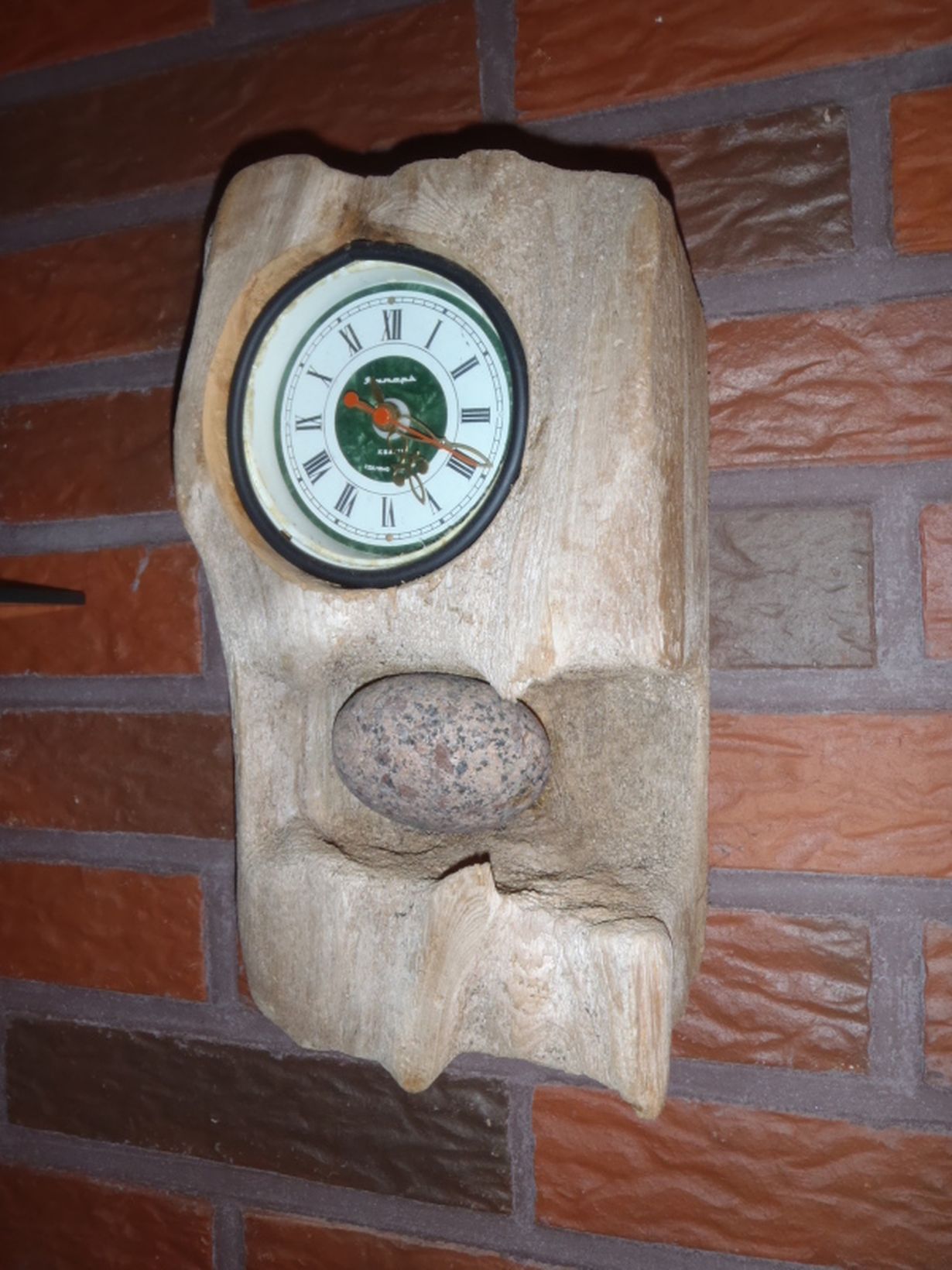 Tämän kellon tekoaineet löydettiin Kallio -nimisestä saaresta. Saaressa toimi 1900-luvun alussa saha sekä pieni sahalla työskentelevien yhdyskunta. Sekä kellon taustana oleva puu että koristeena oleva kivi ovat meriveden muotoilemia. Lapsuudessamme saimme lahjaksi rannekellot ja vanhempamme puhuivat 18-kivisestä kellosta. Taisi niitä kelloja olla useampikivisiäkin. Sitä en tiedä mitä ne kellon "kivet" olivat. Tämä meidän kellomme on siis yksikivinen. Tämä kellon yksikivisyys on myös symboliikkaa sille, että kyseisestä Kallio-saaresta on näkymä avomerellä sijaitsevalla saarelle, jonka nimi on Ykskivi.