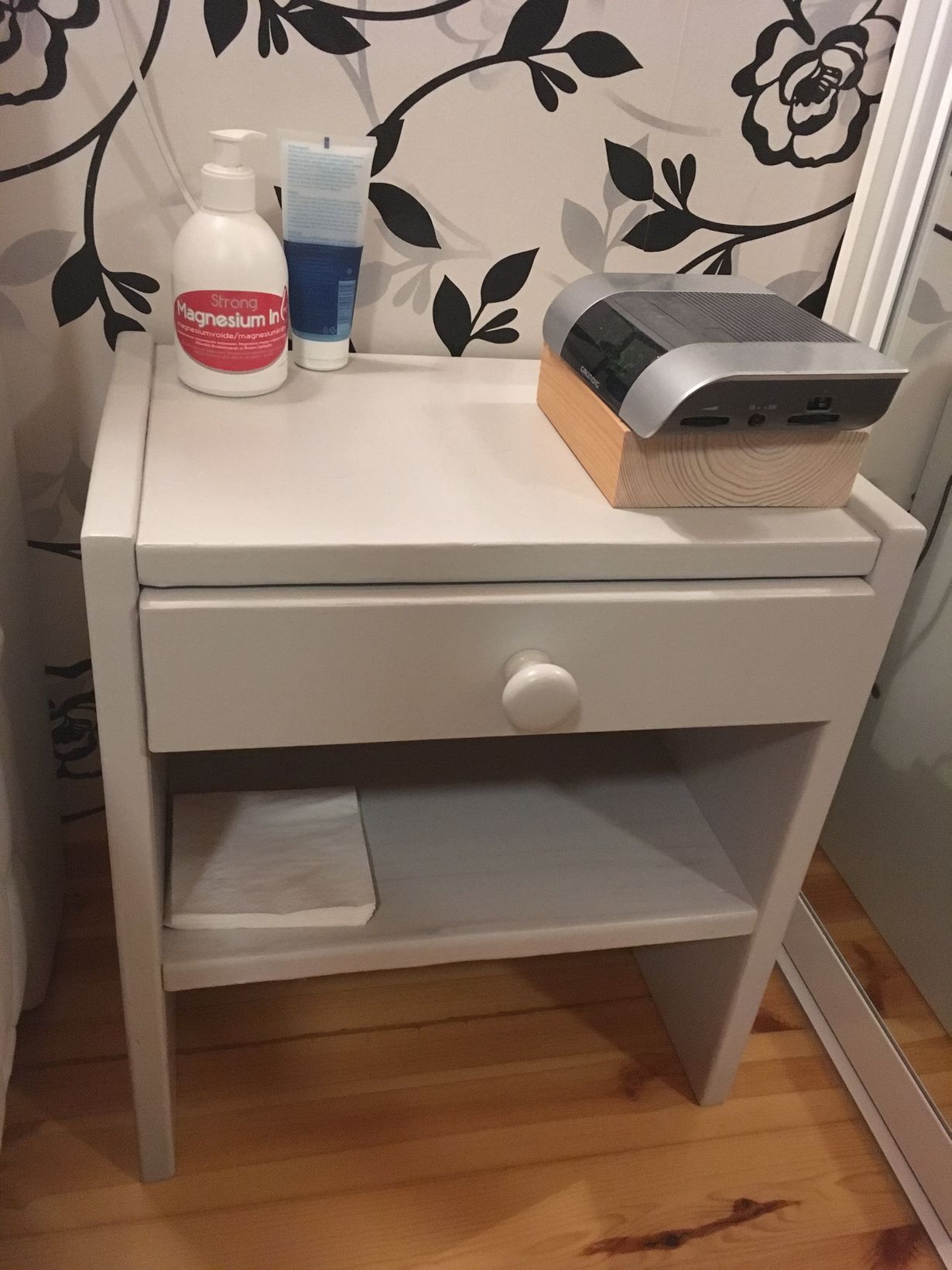 Yöpöytä on hankittu noin vuodelta 1992,samaan aikaan kuin edellinen sänky. Pöytä pareineen on nököttänyt samalla paikalla hankkimishetkestä lähtien,ainoastaan väri on muuttunut matkalla.