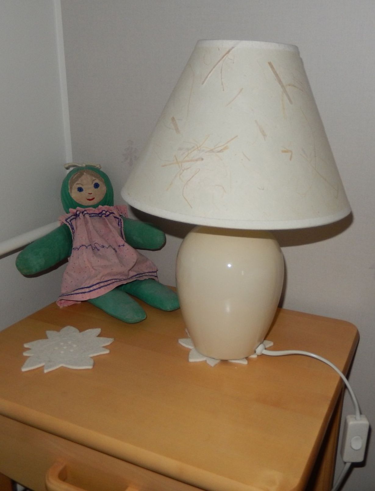 Oma yöpöytäni ja sillä - ennenkaikkea - Molla, rakas nukkeni lapsuudesta. Mollalla on ikää jo reilusti yli 50 vuotta. Olen saanut sen sukulaistädiltä lahjaksi.