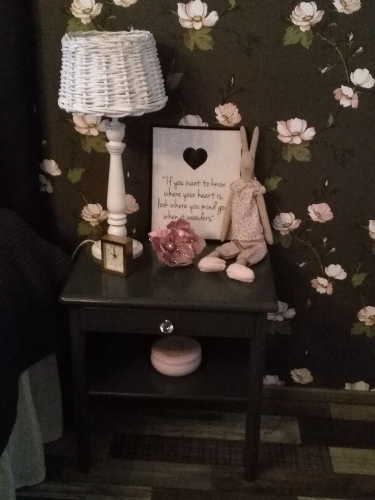Meidän yöpöydät on jostain 1960 luvulta. Moneen kertaan vaihtaneet väriä, mm. roosa ja vihreä. Nyt harmaa sopii makkarin väriin. Ja uudet bling-bling vetimet!?